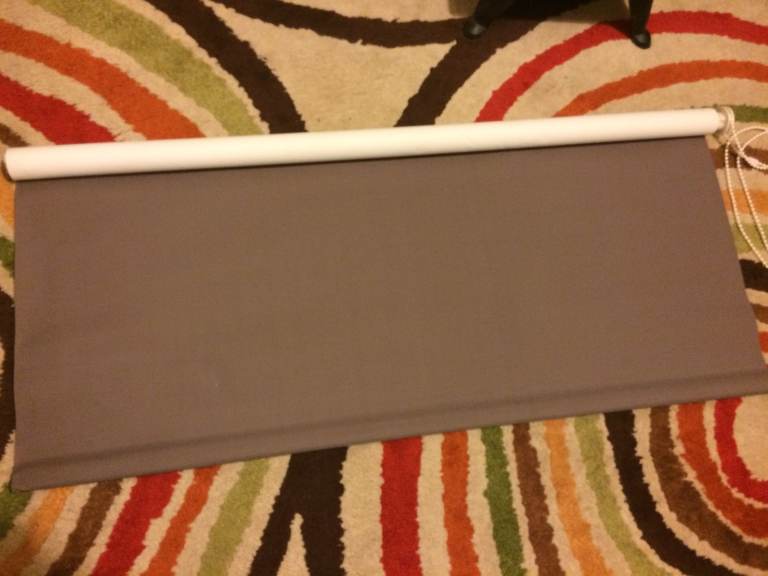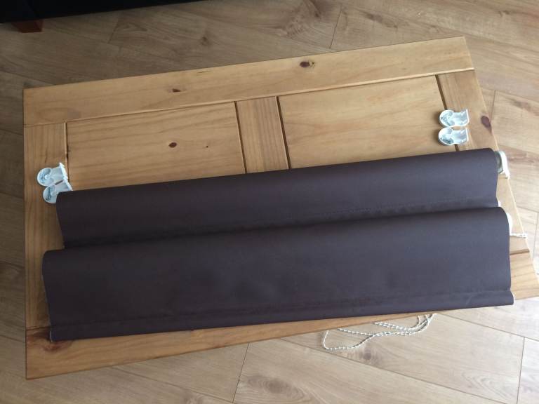 Pair of black-out roller blinds in brown with mounting brackets, in good condition. Approx. 88cm wide (91cm with brackets). Pair of black-out roller blinds in coffee colour with mounting brackets in good condition. Approx. 92cm wide (95cm with brackets). Extension over 160cm. £20 per pair.