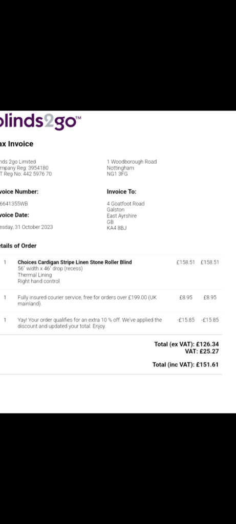Brand new thermal blackout kitchen blind from blinds2go only took out the box for photos all brackets and fittings supplied. Wrong size and colour sent .please no time wasters.fixed price thanks .