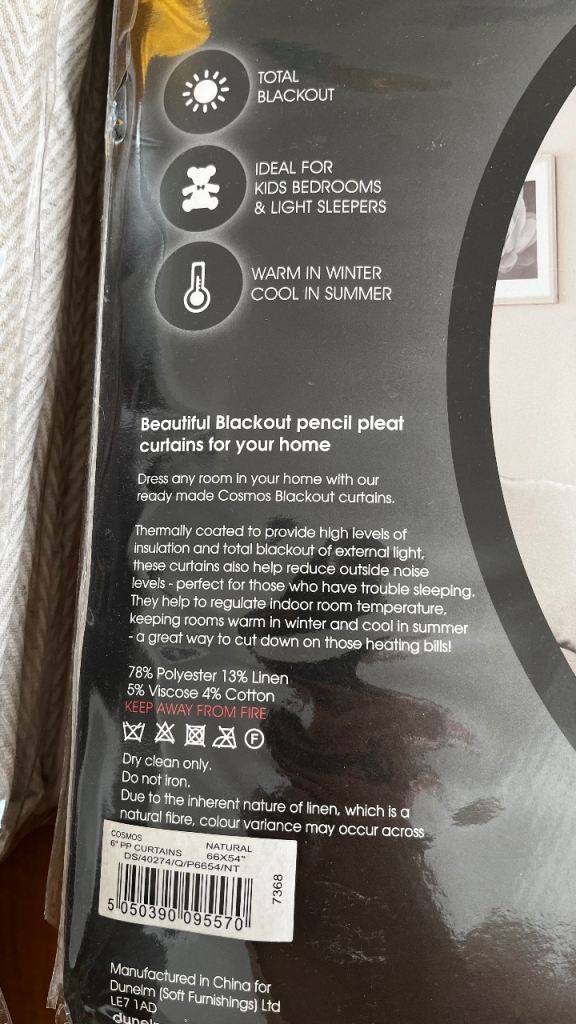 Made from a blend of polyester, linen, viscose, and cotton, these blackout curtains have a lovely feel. The lining provides complete blackout and added insulation, keeping the room cooler in summer and warmer in winter.