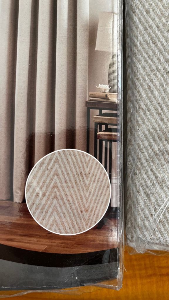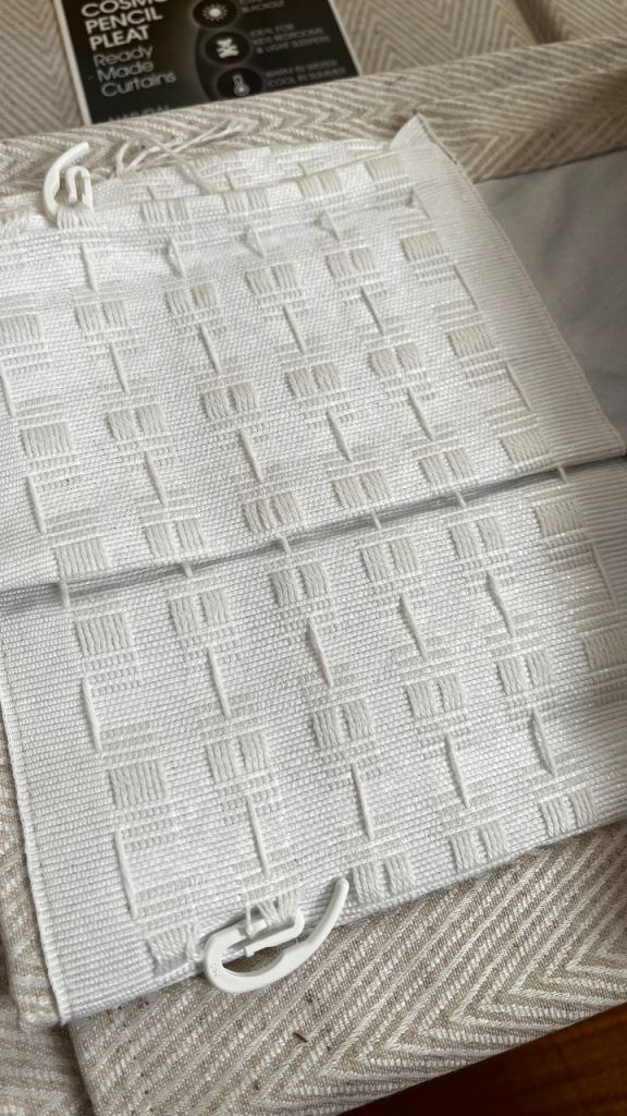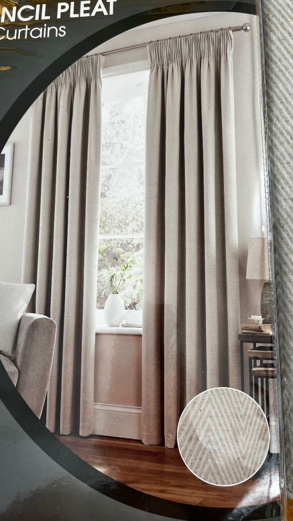 This is a brand new set of readymade curtains and tiebacks from Dunelm in Cosmos style with blackout, thermally coated lining. They have a pencil pleat and are in a classic beige / cream colour with a subtle zigzag pattern. The design would fit neutrally in any decor.