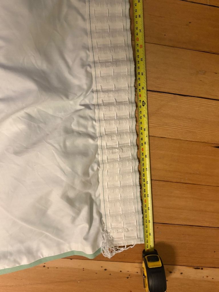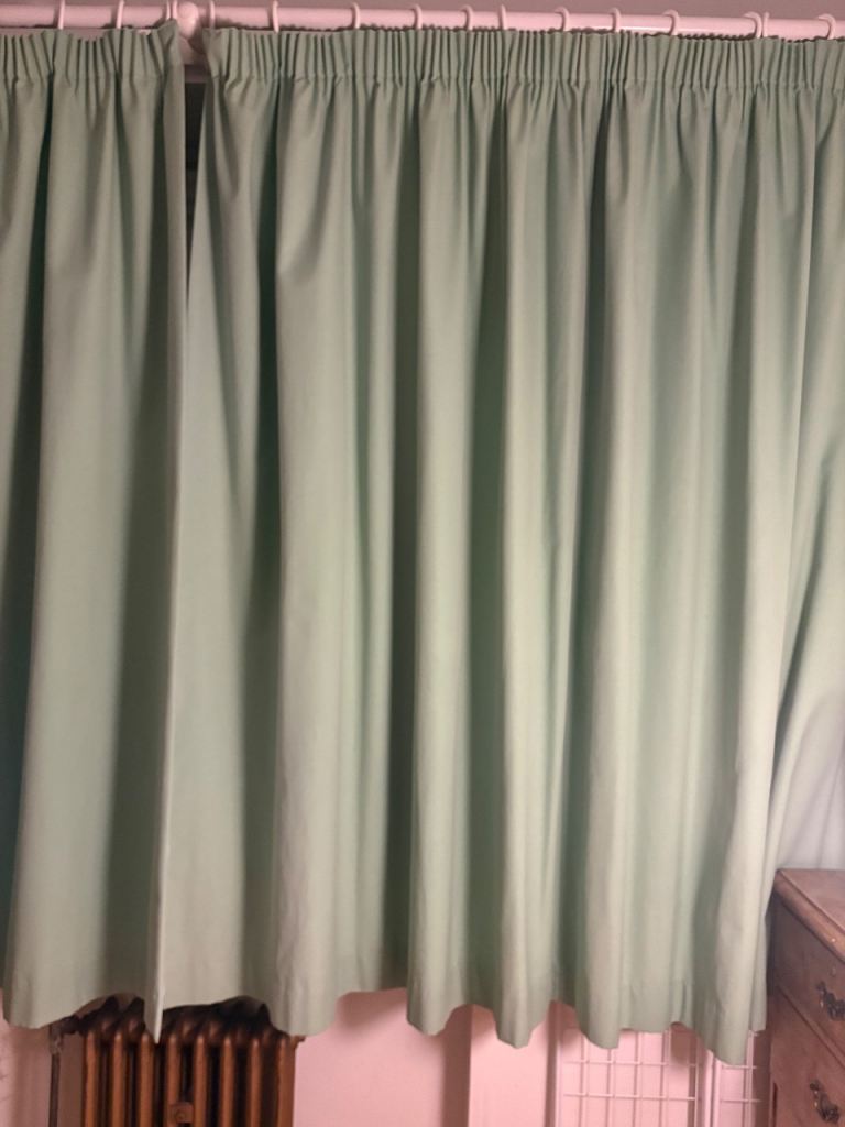 Lined pencil pleat cotton curtains in a fresh apple-green colour. The drop is 164cm and each curtain is 118cm wide when fully open (I.e. unpleated)