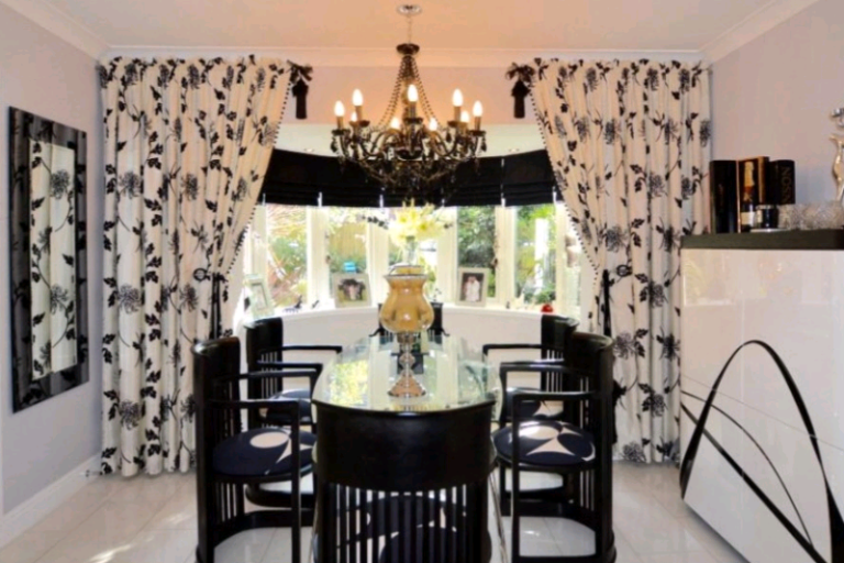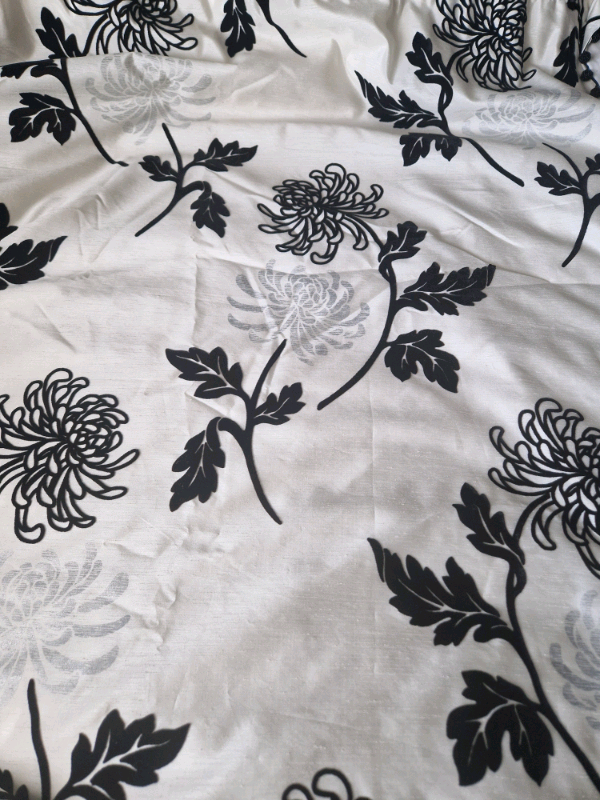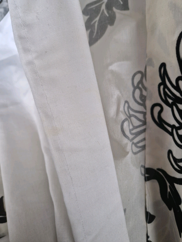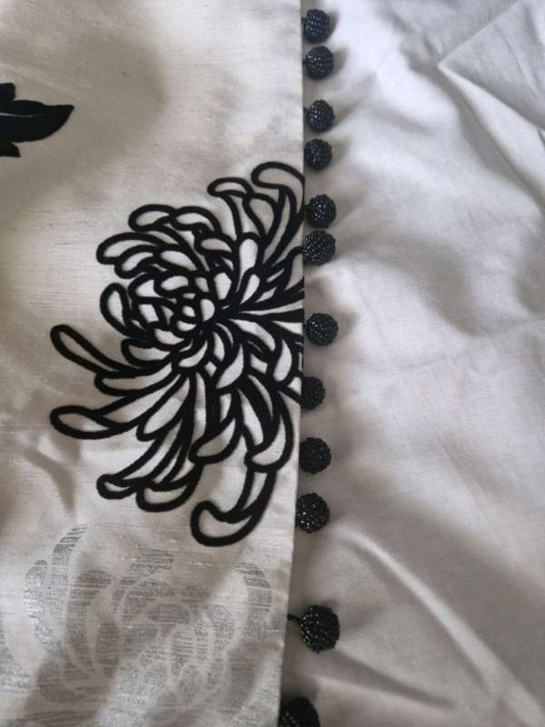 Beautifully handmade, rod pocket, lined curtains with black beaded tassels down inside length.