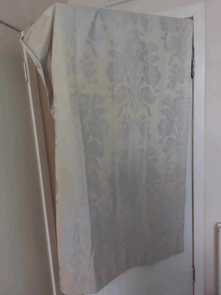 Black velvet, silver shimmer design on ivory coloured material.