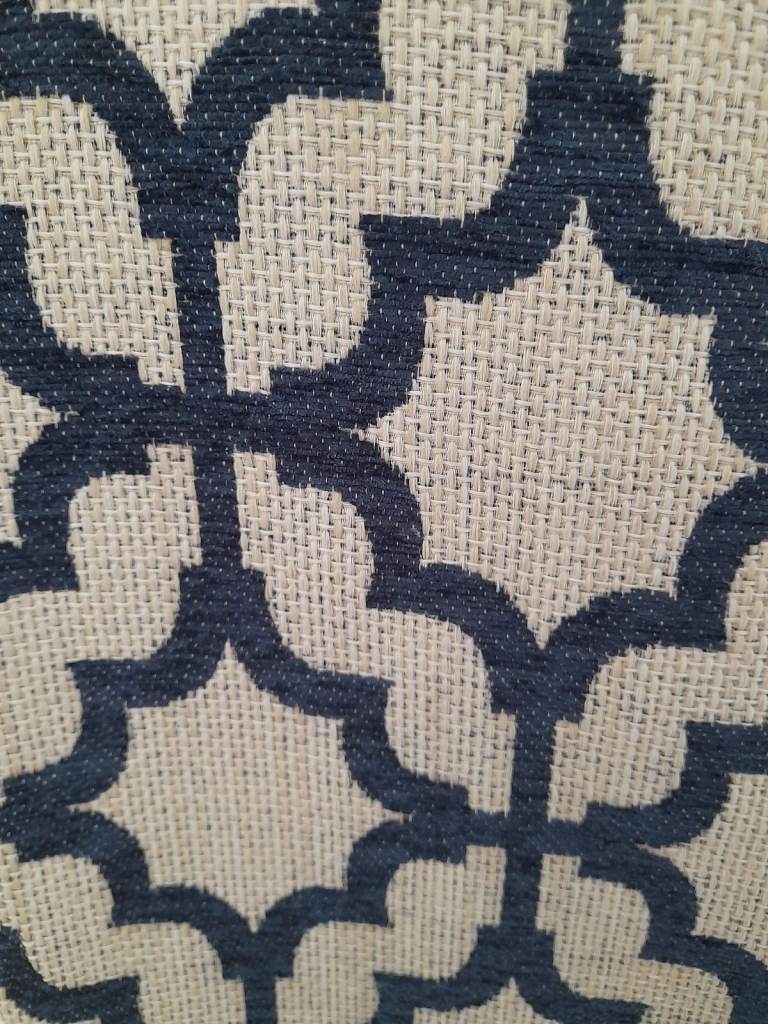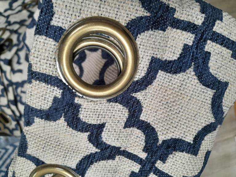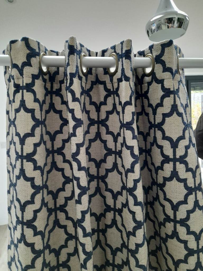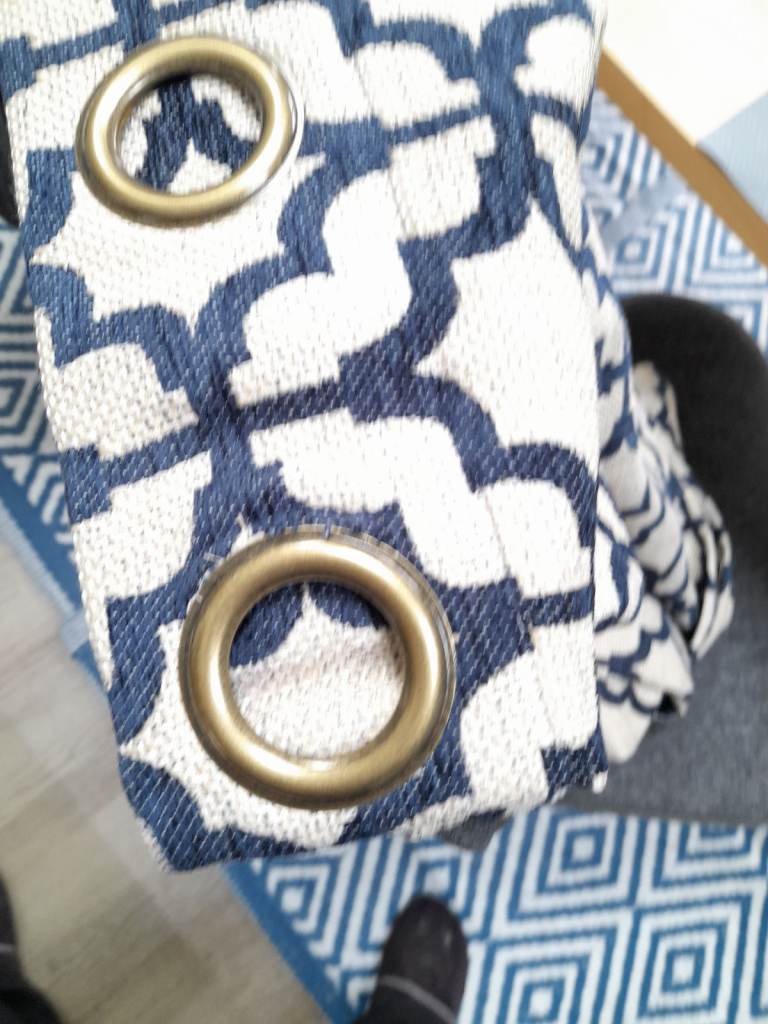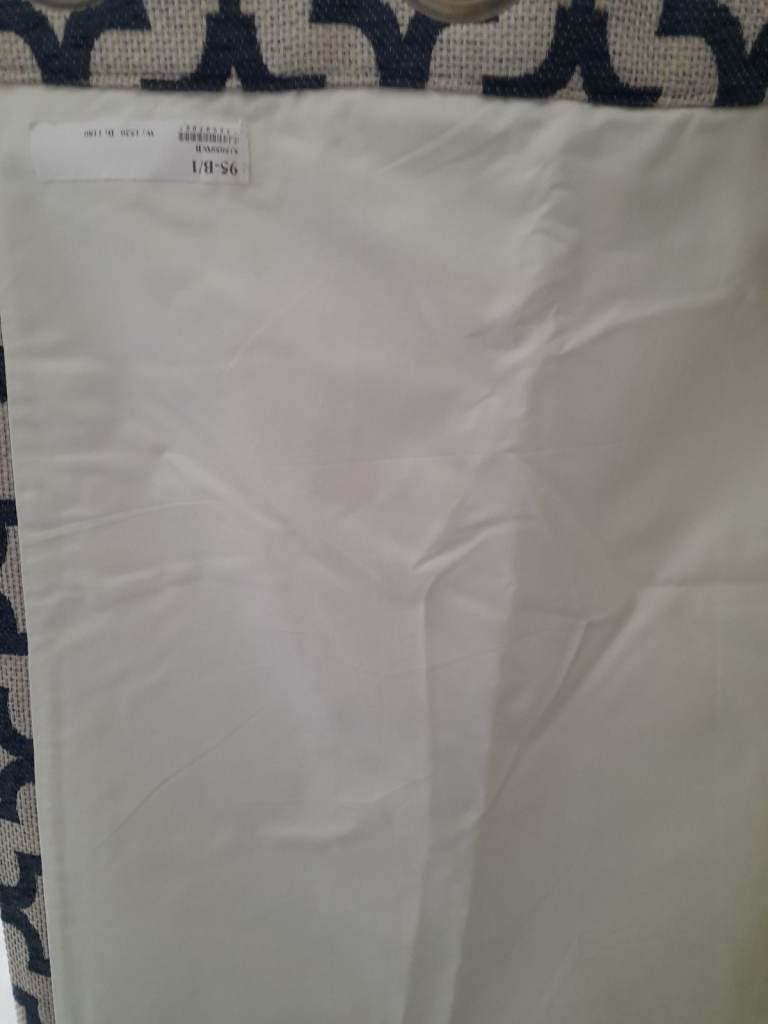 1 pair of curtains with eyelets, blue & beige, width at top in straight position is 44 inches, drop is 46 inches. the lining is blackout lining I believe .On a couple of the eyelets the fabric has pulled out a little.