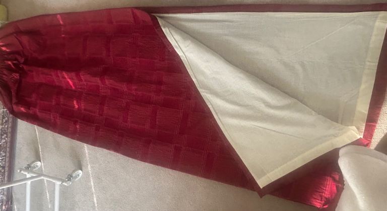 Curtains - Deep Ruby-Red red fully-lined curtains’ pair make a bold and luxurious statement the moment someone enters the room. The rich ruby tone is deep and saturated, catching the light with a subtle sheen that adds warmth and drama without feeling overpowering. Their thick, substantial fabric hangs with confident weight, falling in smooth, structured folds that give the space a refined, tailored look.