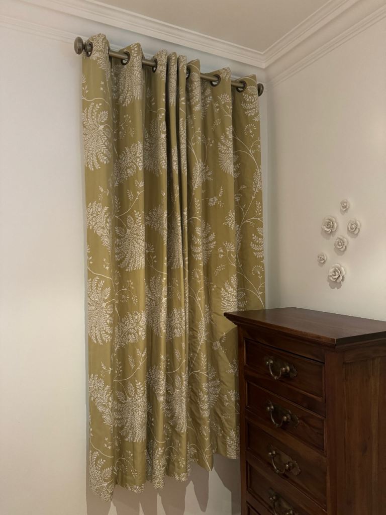 Curtains Eyelet with the curtain pole - John Lewis - handmade. A very light green with some flowers embroidered into them. Measures coming!