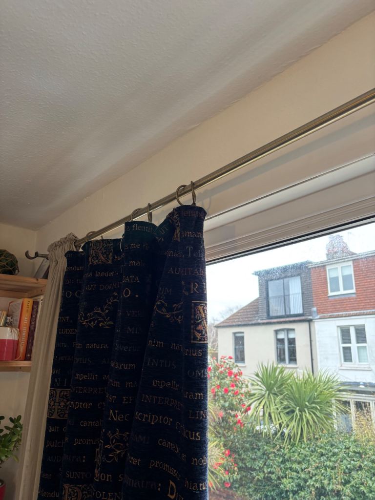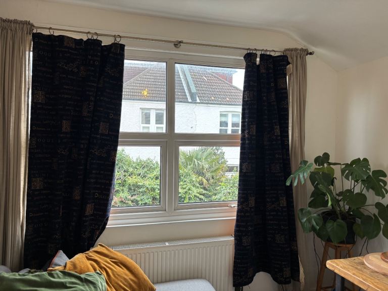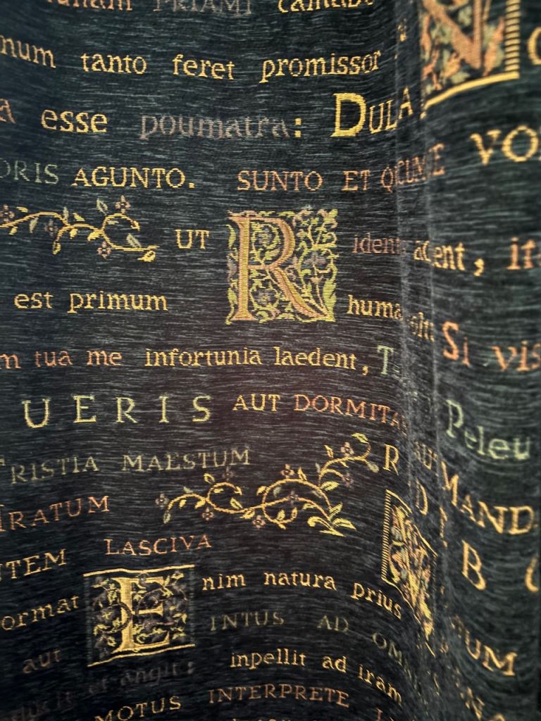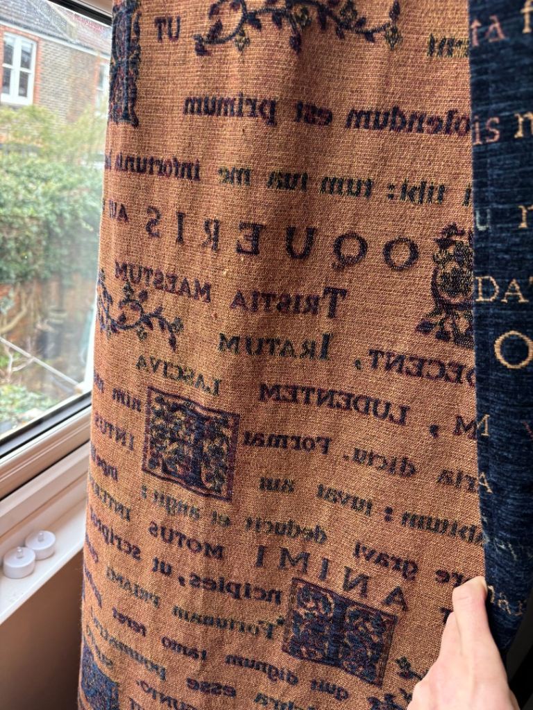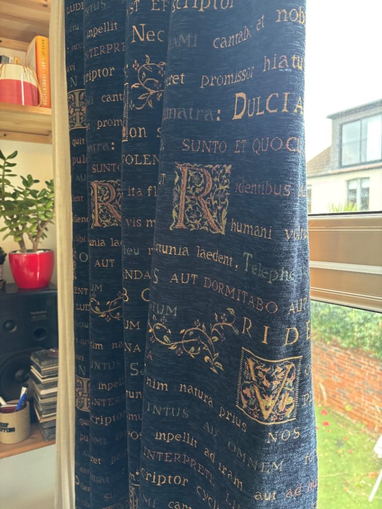 Amazing curtains in great condition with fringe on one side. Interesting Latin print, they aren’t lined but are great quality and a good weight.