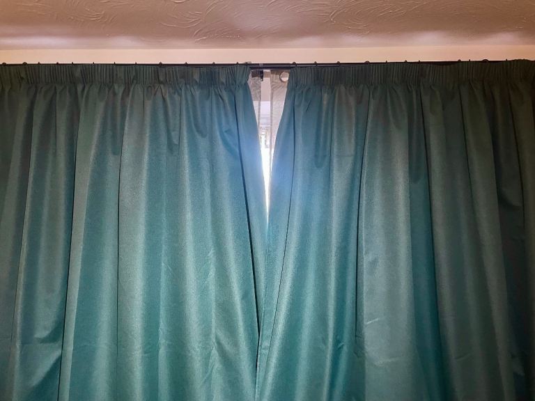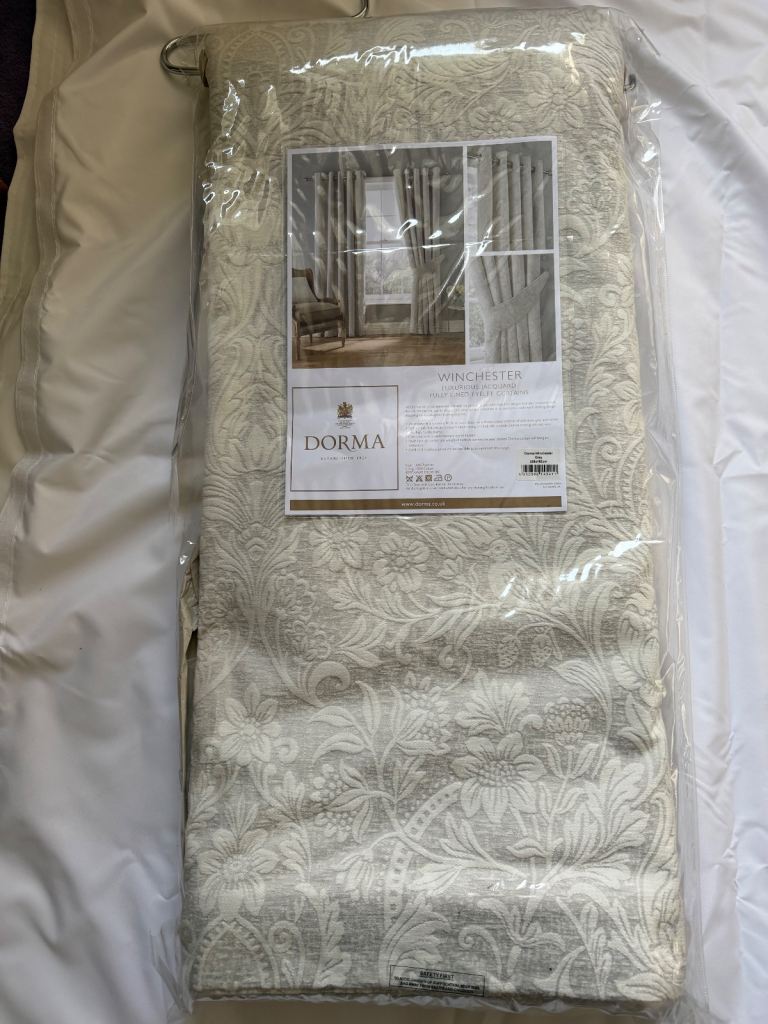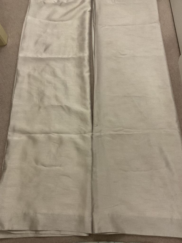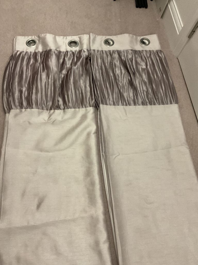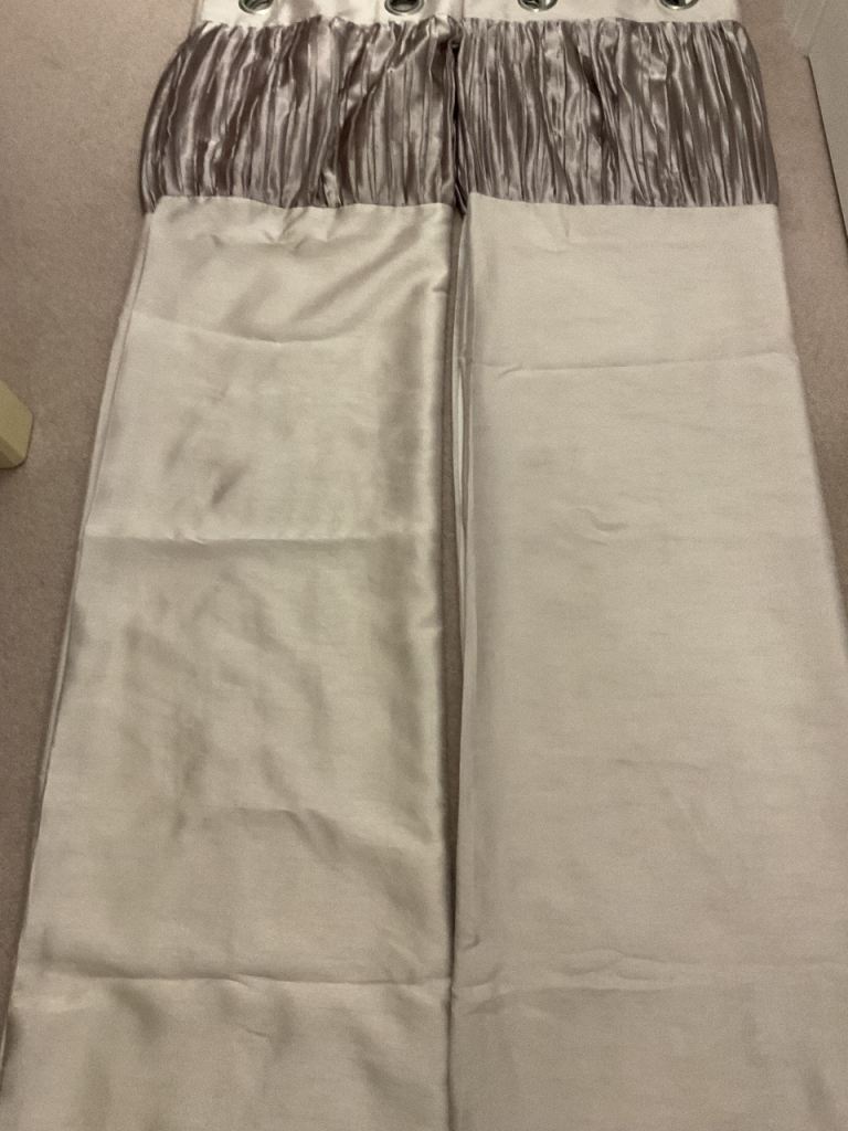 Lovely grey silky material lined curtains with attractive ruffled heading, each curtain measures, length 176cm x width 170cm, excellent clean condition, buyer to collect.