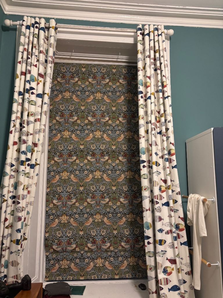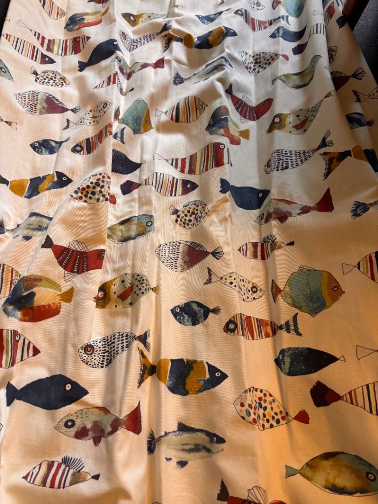A nice white/cream base with blue fish. It is the Prestigious Textiles Gone Fishing Vintage fabric. The cost £350 to be made new.