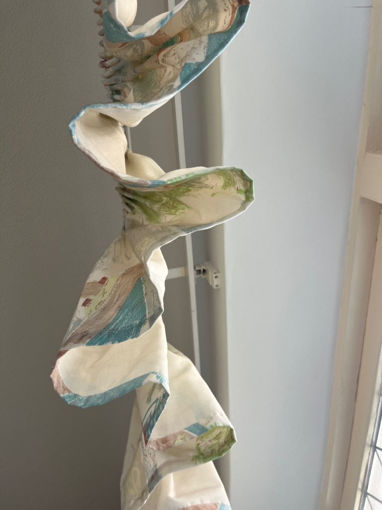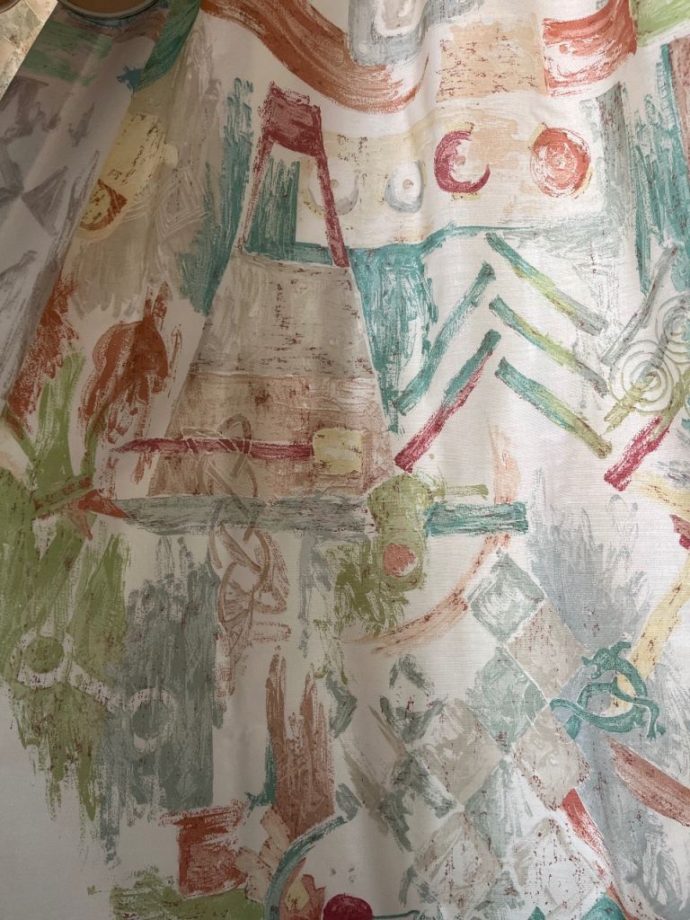 Off white curtains with green blue and red abstract pattern