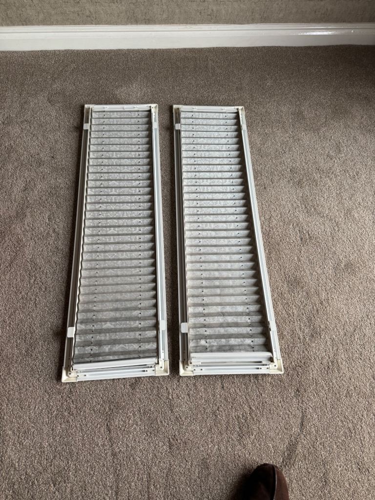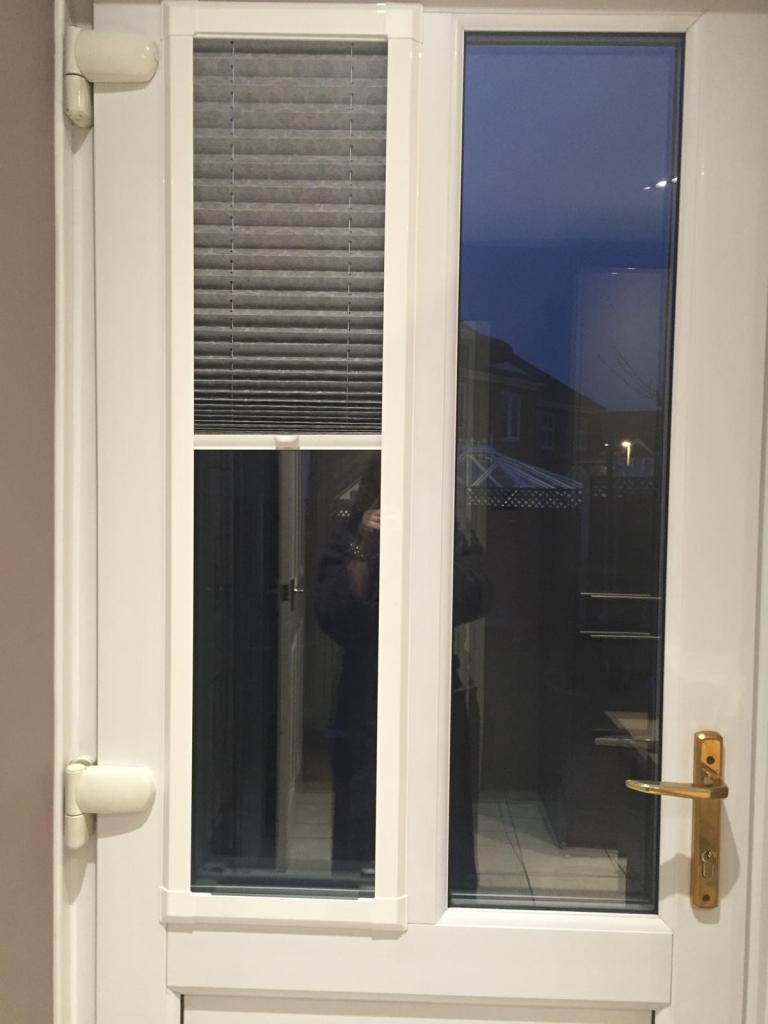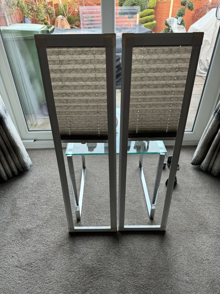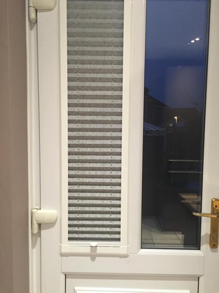 Hillary clip in UPVC door blinds. Two pairs.Vertical pull down. Fits into UPVC door aperture clips in place with no fixings required. 1035mm high x 250mn wide. Grey effect fabric finish. Excellent full working. Collection only.