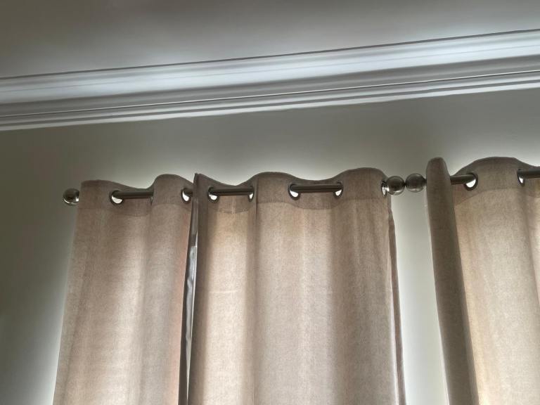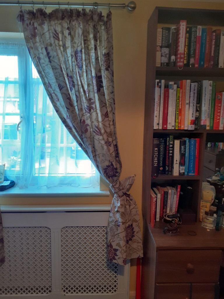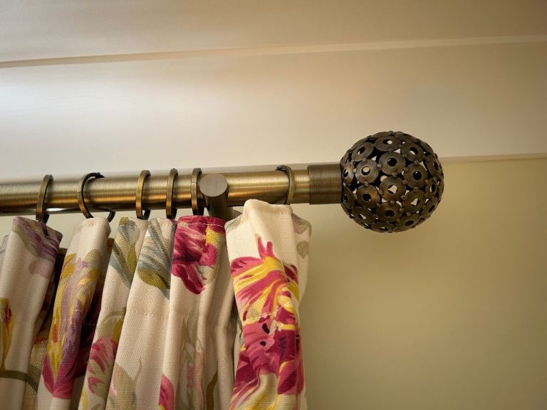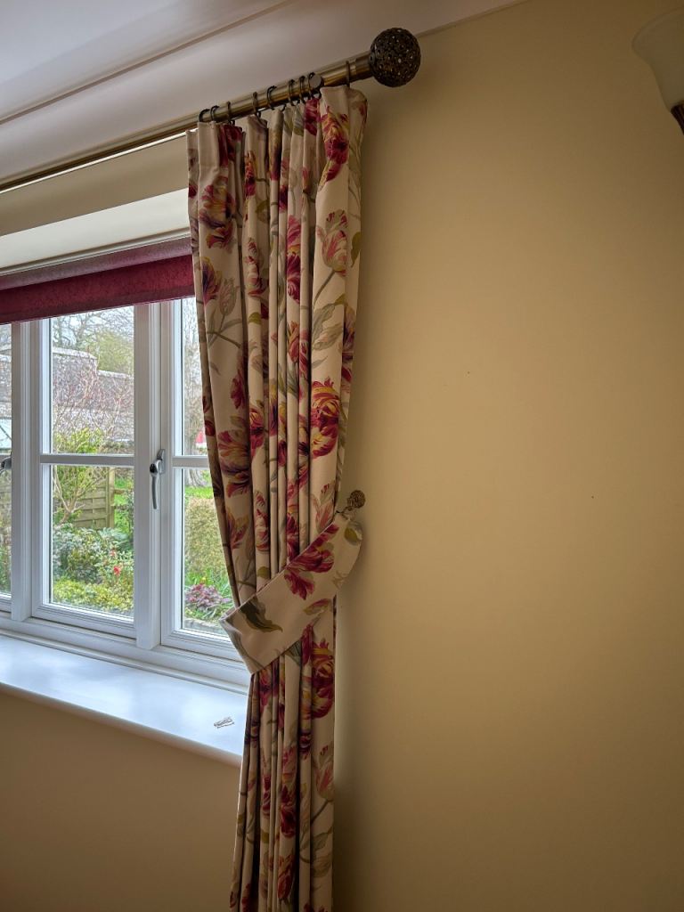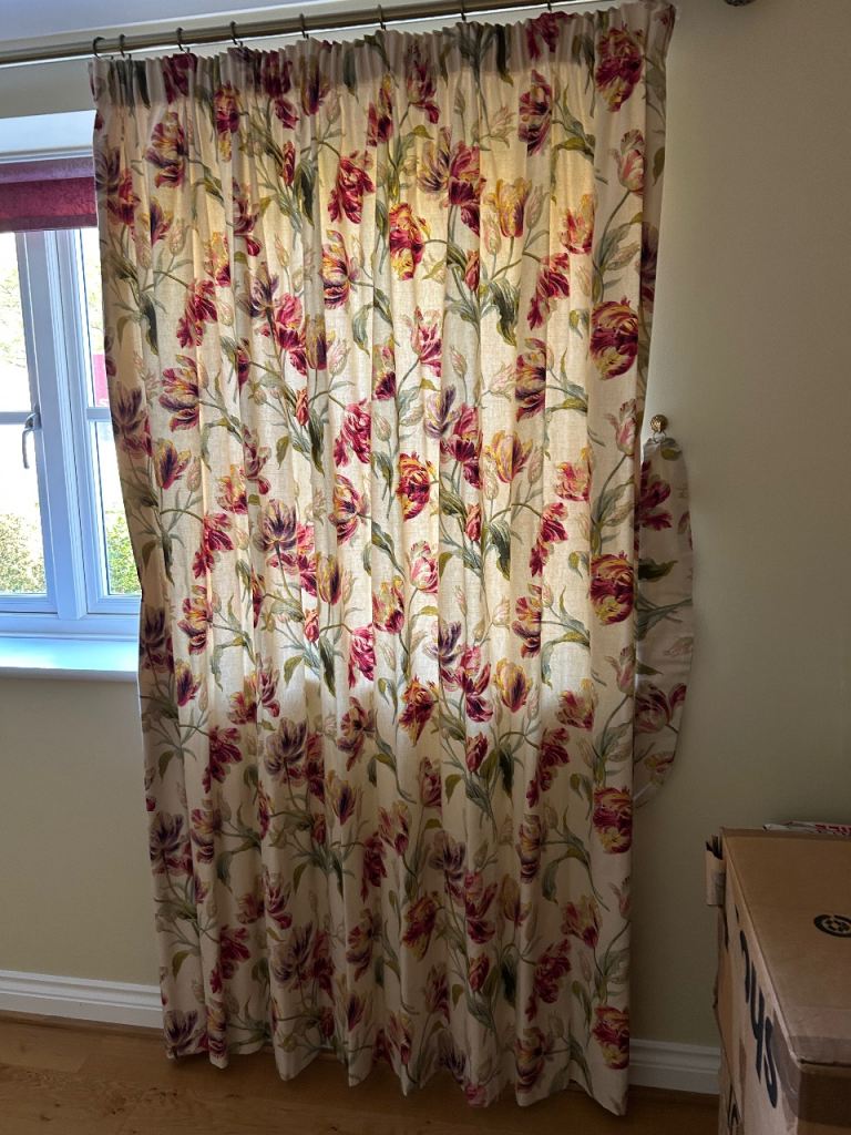 Beautifully made, full length, lined curtains with matching tie backs. Attractive pencil pleat headings. Complete with metal curtain rail with decorative finial.