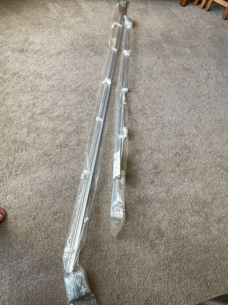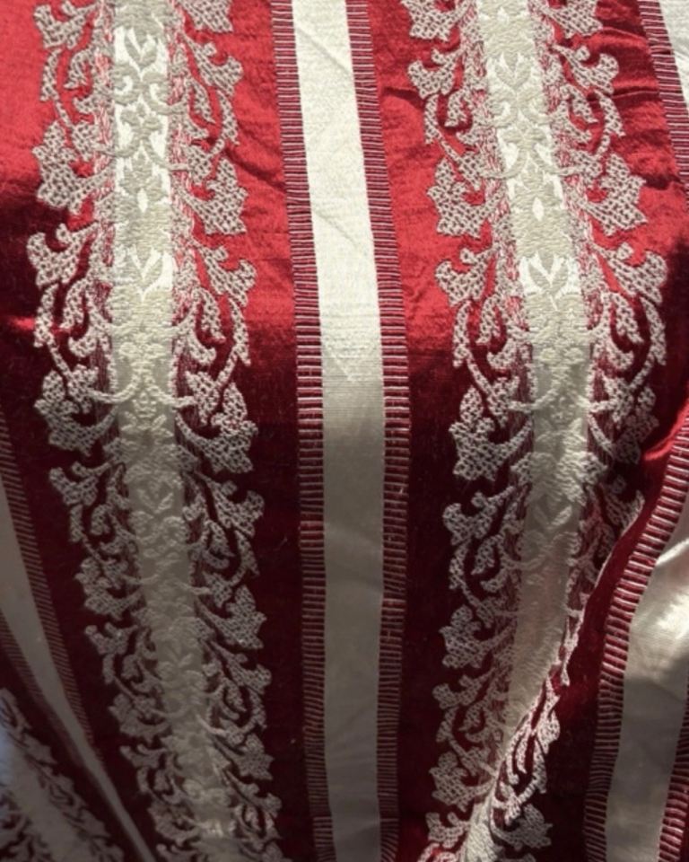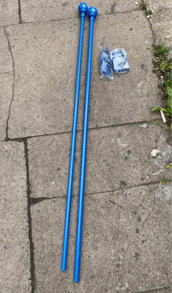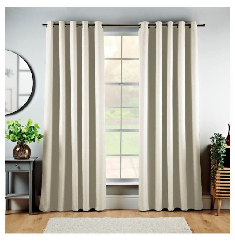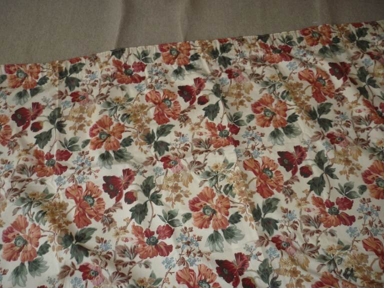 Beautifully made, full length, lined curtains with matching tie backs. Attractive pencil pleat headings. Complete with metal curtain rail with decorative finial.