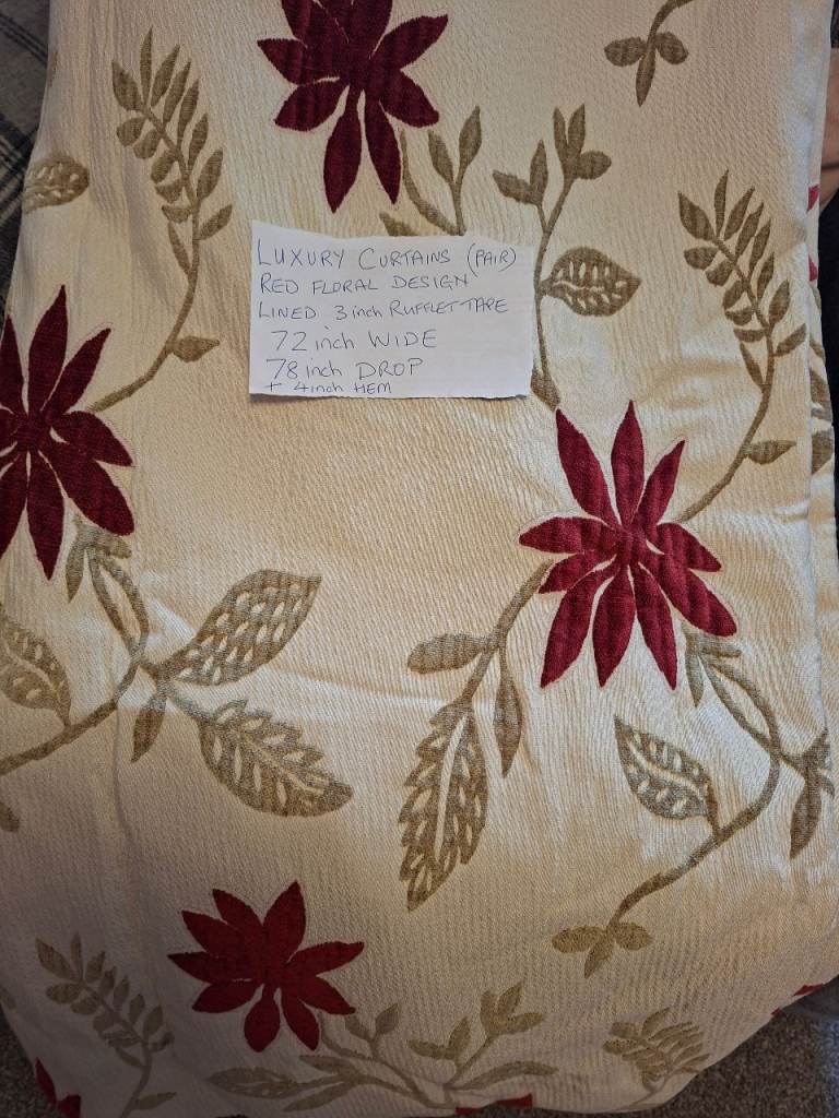 Lovely pair of luxury curtains with a beautiful red floral pattern.