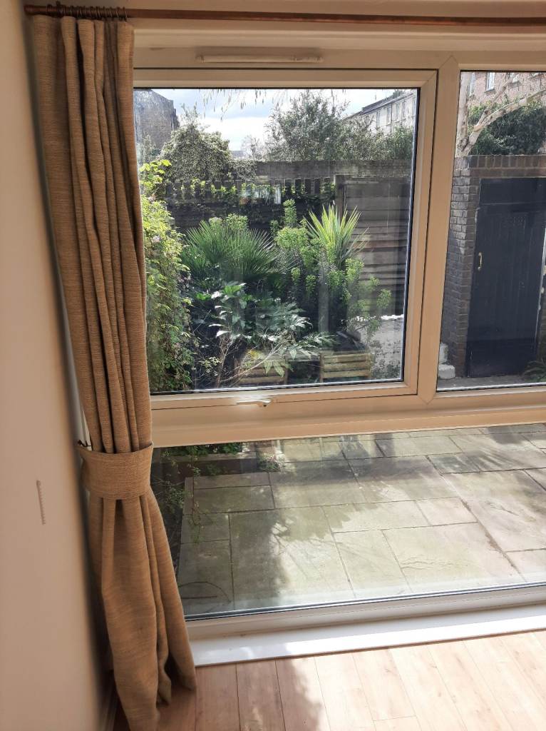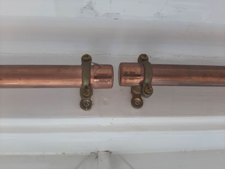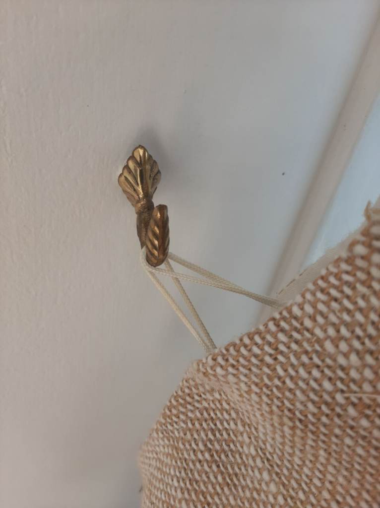 A calm and minimalist jute curtain with white cotton lining, matching sleeves and copper railings. Two different widths.