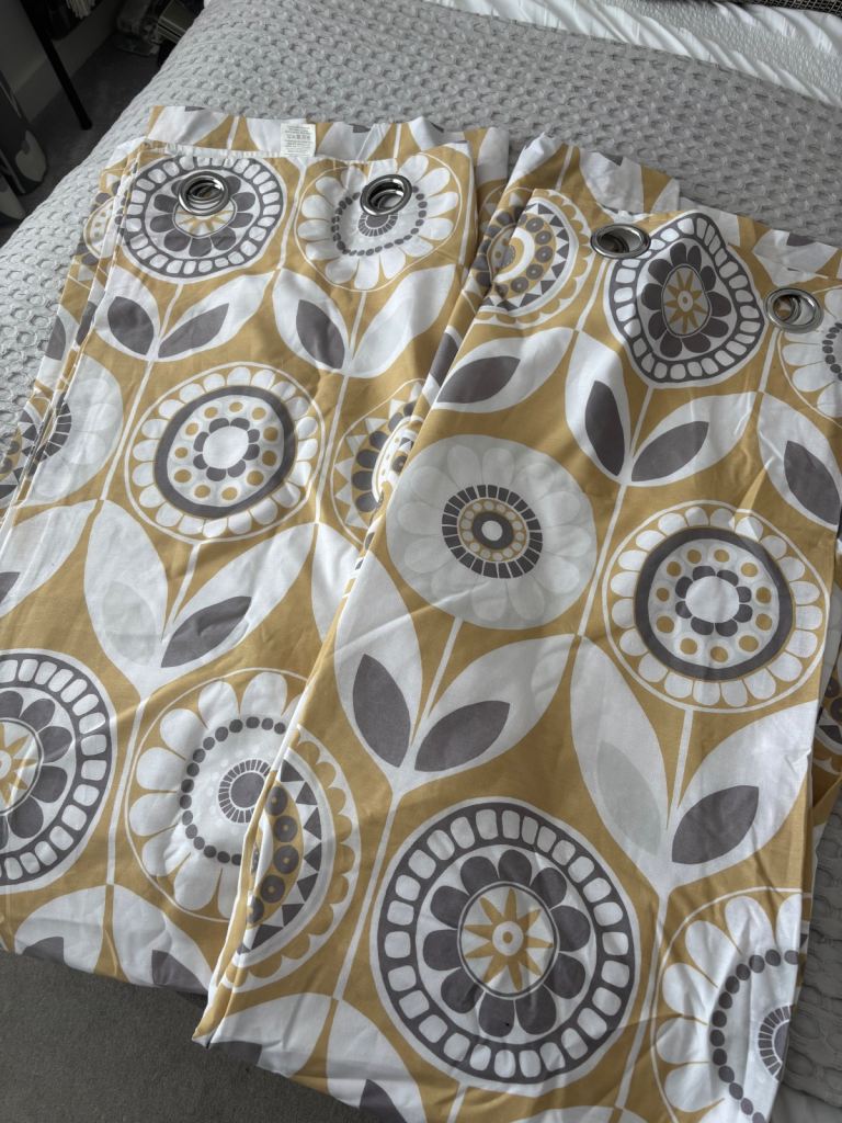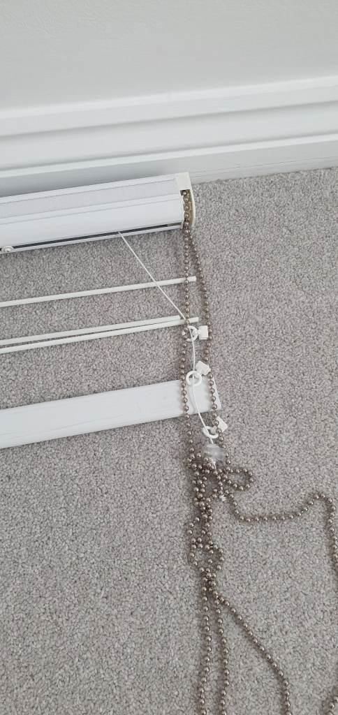 Made to measure from Blinds Direct, designed to fit inside a window opening, sitting in front of the window. The blind measures approximately 94cm x 54cm. Operated by a chain.