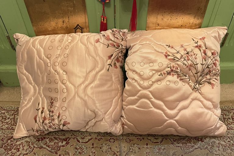 Pair of Dusky Pink Patterned Curtains with Eyelets – Good Condition