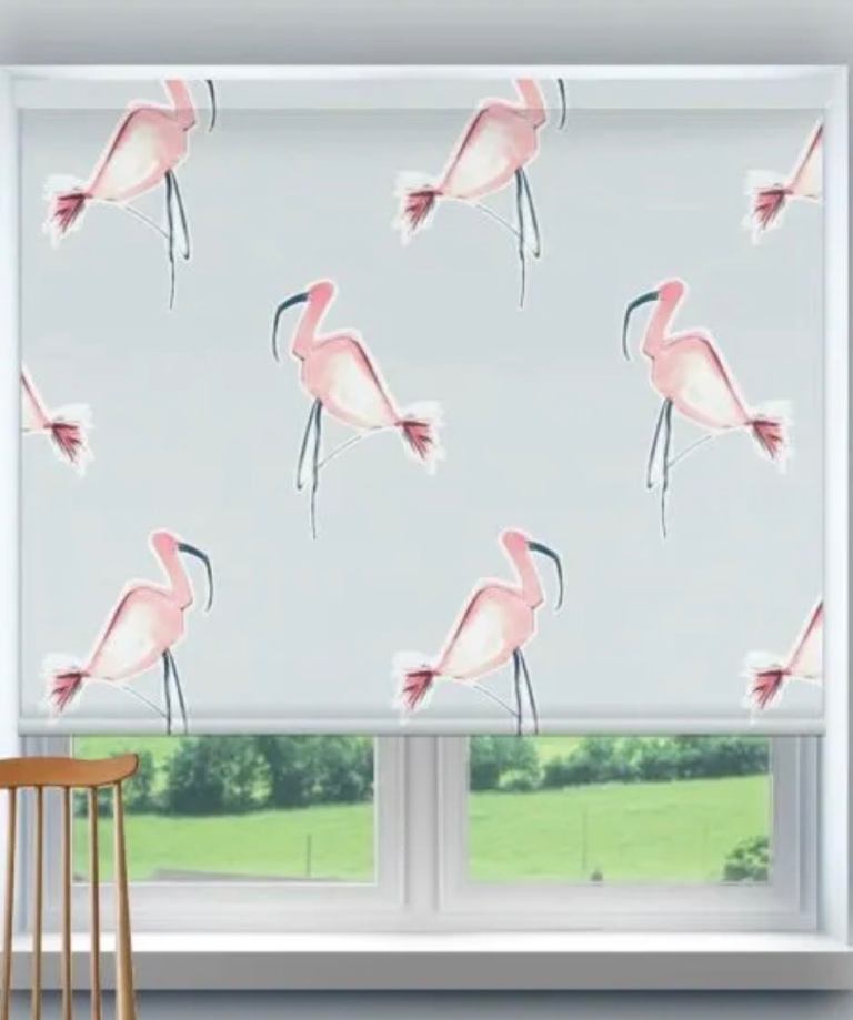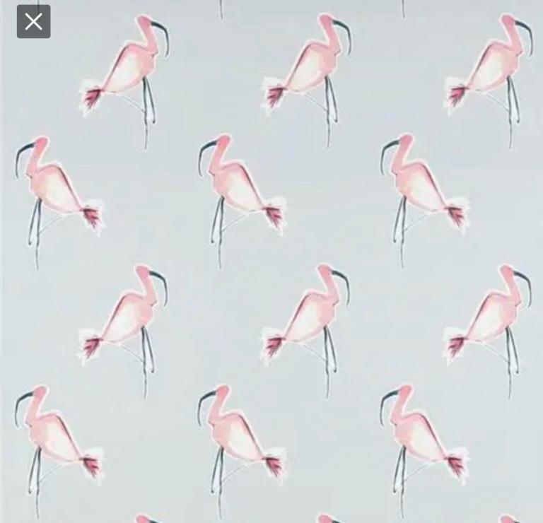 A fun and playful design featuring multidirectional pink cranes on a soft blue/grey ground.