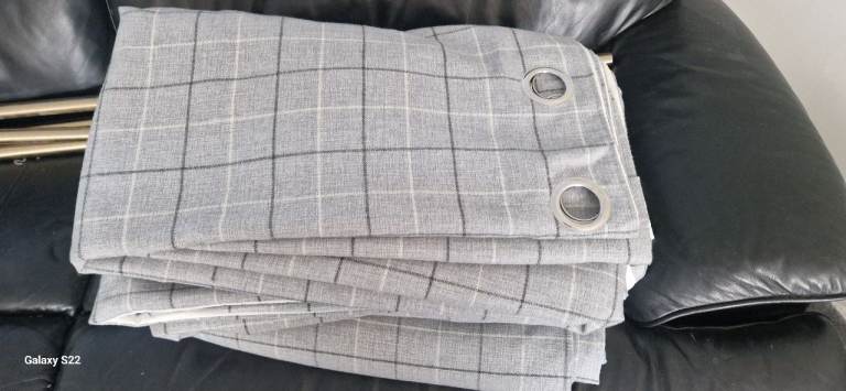 Heavy weight Fully lined eyelet Silver grey curtains with black and white check 90wx90 drop 2 pairs
