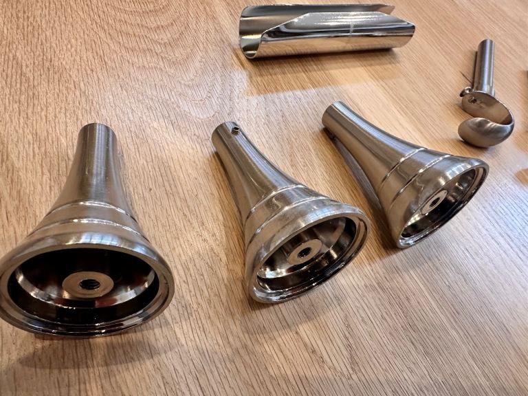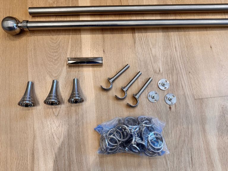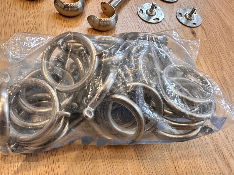 High quality, 3 metre length, 28mm width, stainless steel curtain pole including all fittings, finials etc. and 30 stainless steel curtain rings.