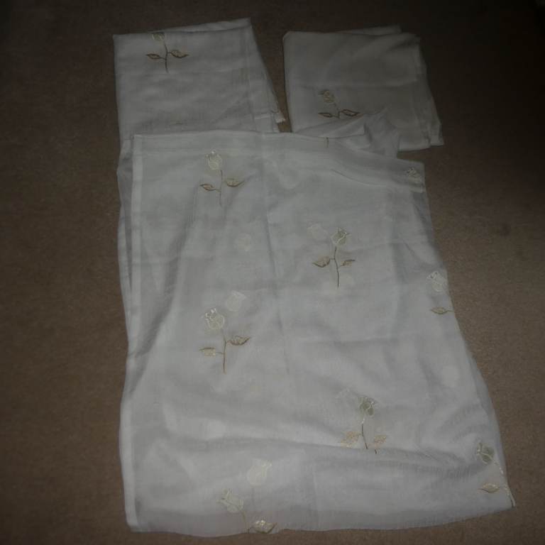 Set of 3, one panel 54" x 74" drop, the other two, 54"x 56", polyester material, very delicate and pretty. Unused, as purchased - as not recuired after house move. Price is per panel.