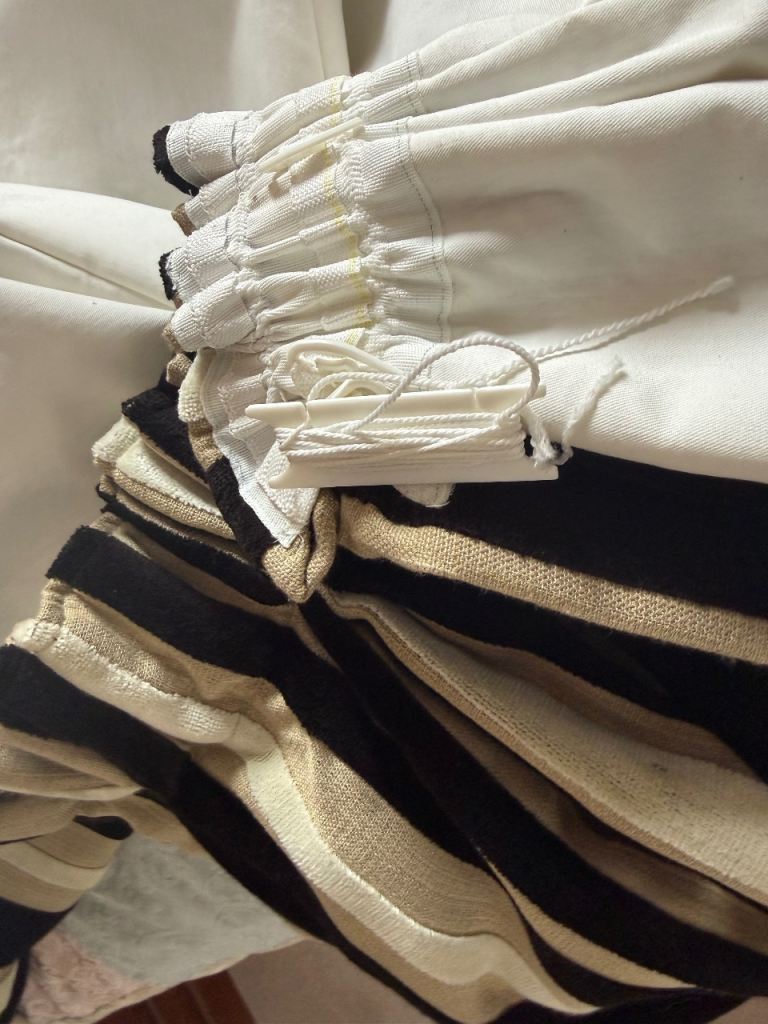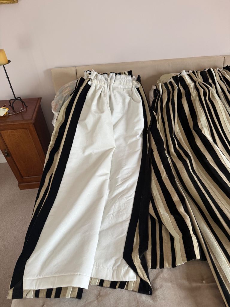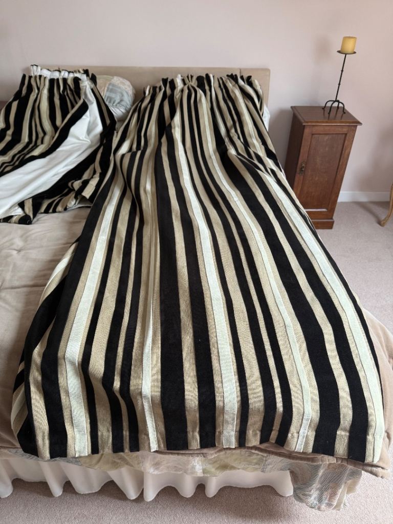 128 and 213 drop, linen effect fabric with a black and cream velvet stripe , suitable for up to 280/300 pole. A little staining on lining of long curtains as shown in photo.