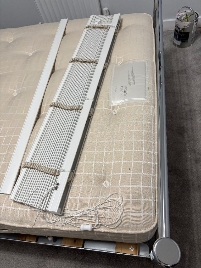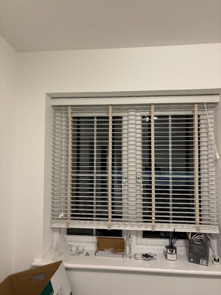White wooden blind fully working suitable for window size 112cm hight 118cm wide not sure of make but very good quality