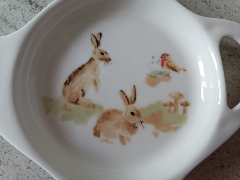 The drawing adorning this holder is simply beautiful, 2 bunny rabbits and a robin playing in the fields.