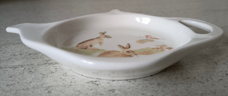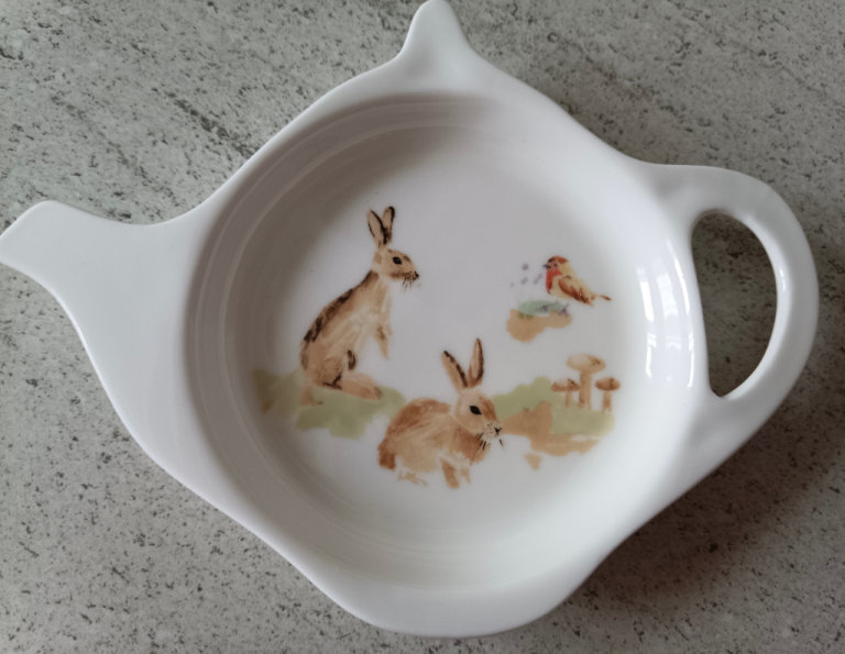 Exquisite tea bag holder made from fine china in the shape of a teapot.