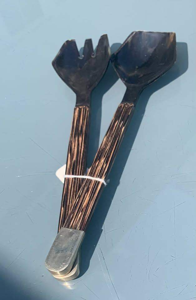 Hand made black horn salad servers with wood handles and brass finials - Condition NEW!
