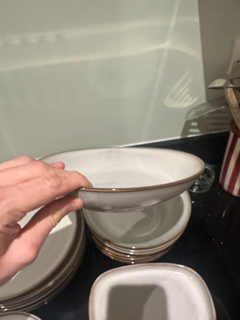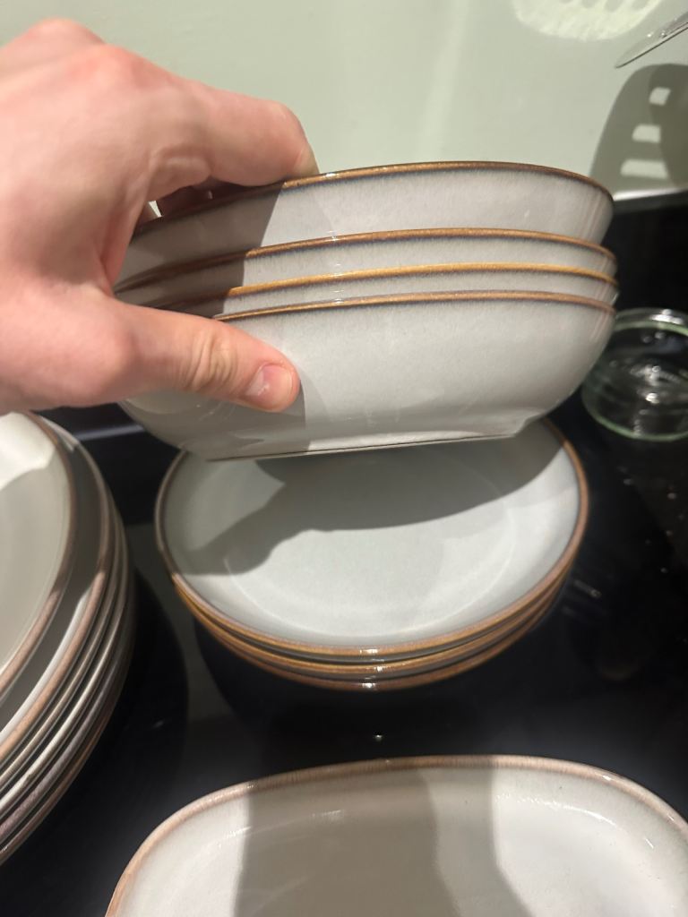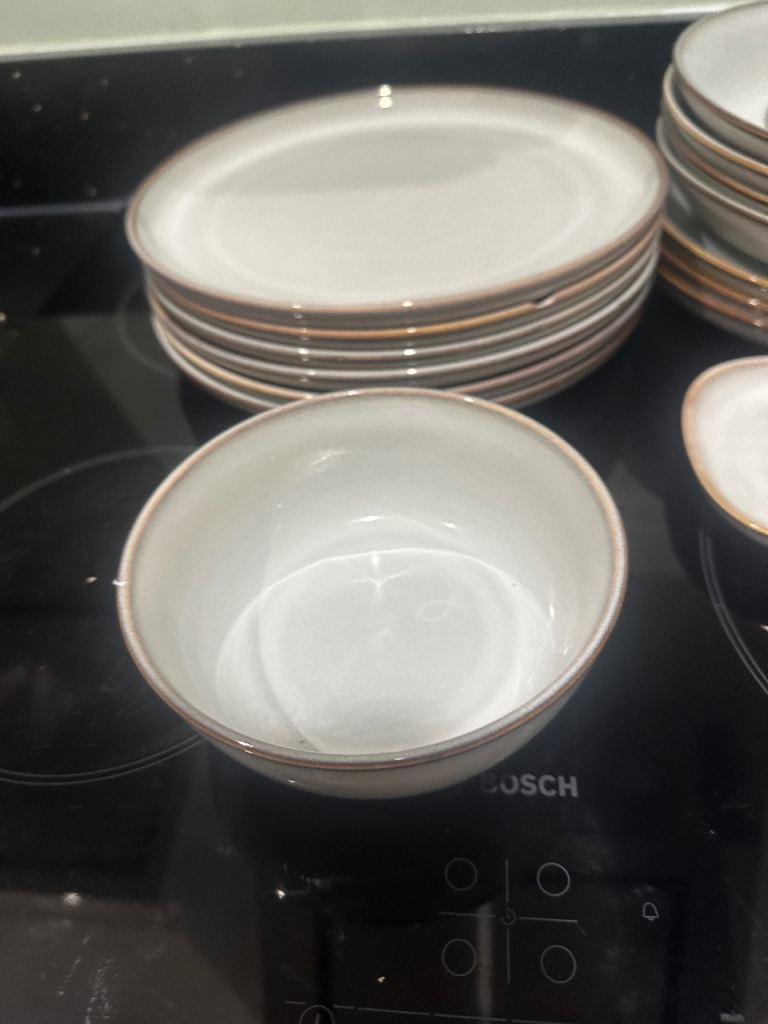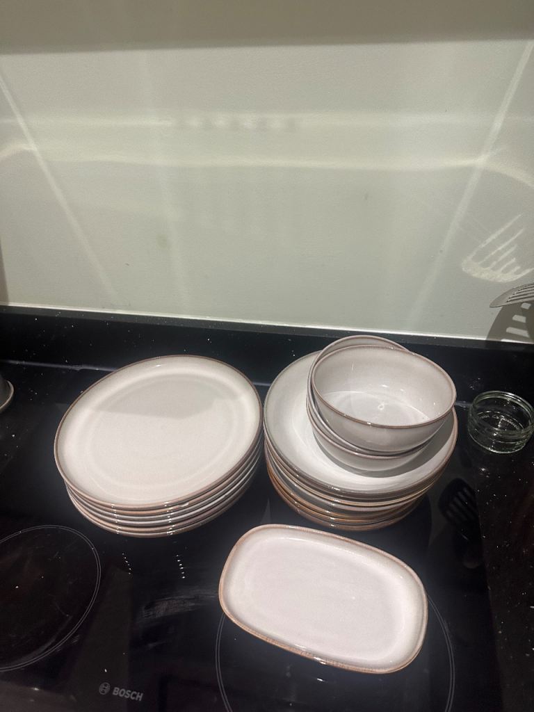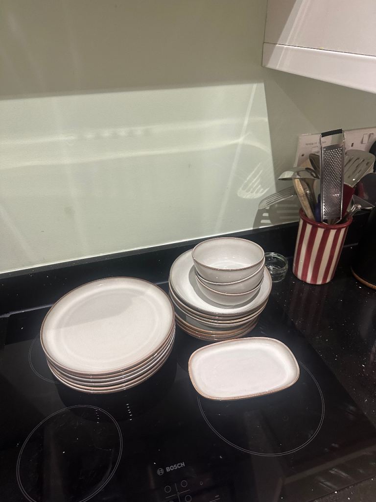 Available for collection, 8 plates, 4 large bowls, 4 smaller bowls and 4 small plates (note some plates in dishwasher now)