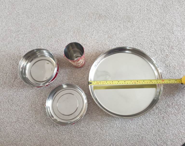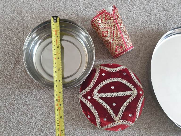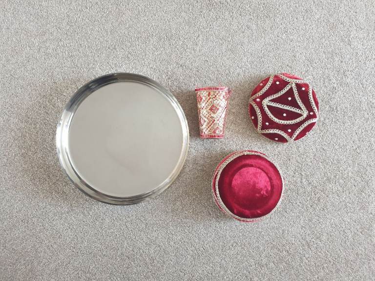 Essential Indian wedding thali set of a 12 inch steel thali, steel cup decorated in red & gold and a 6.5 inch box for dried fruits etc also fully decorated. All used once and in like new condition