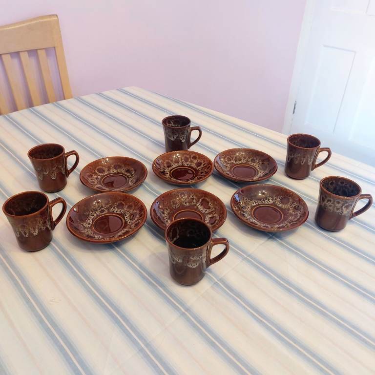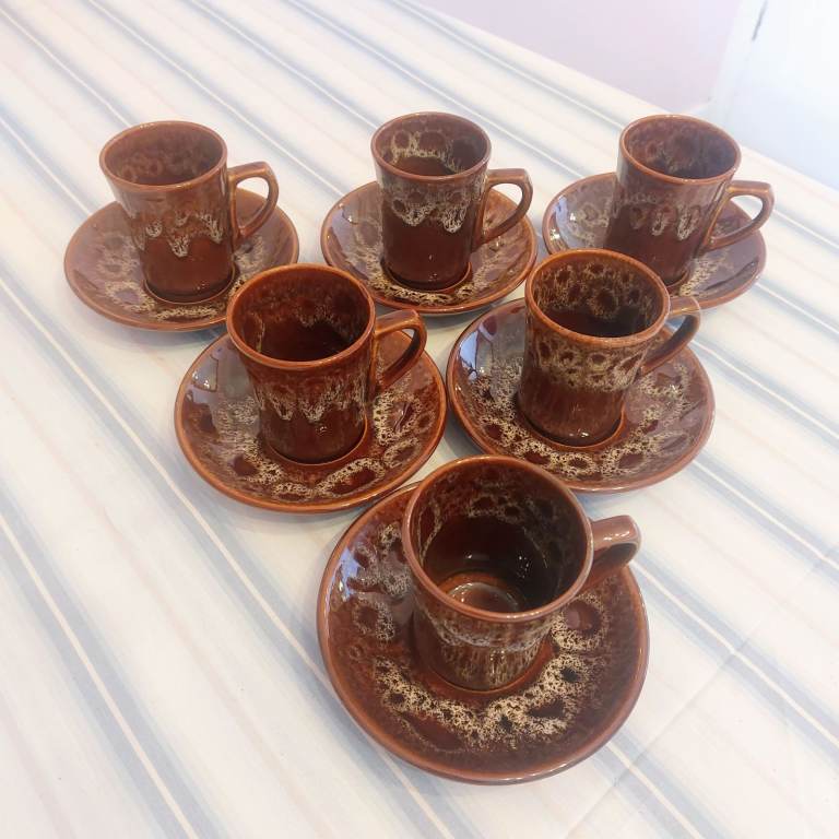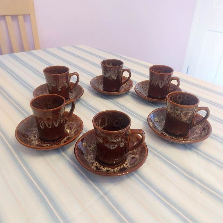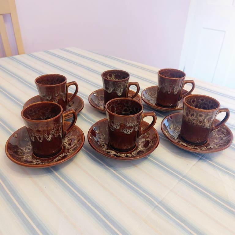 Lovely set of six vintage Kernewek Pottery coffee cups and saucers with a unique drip glaze finish.