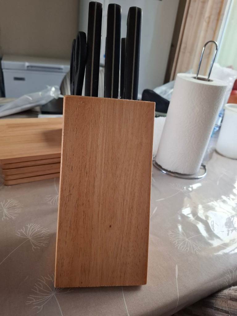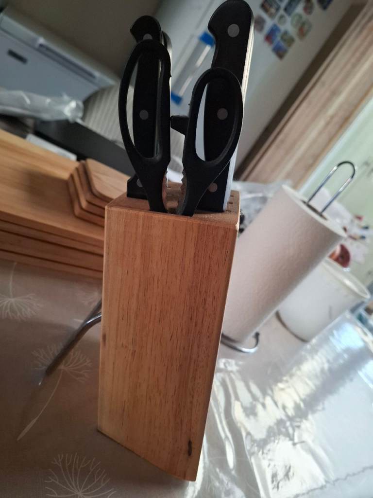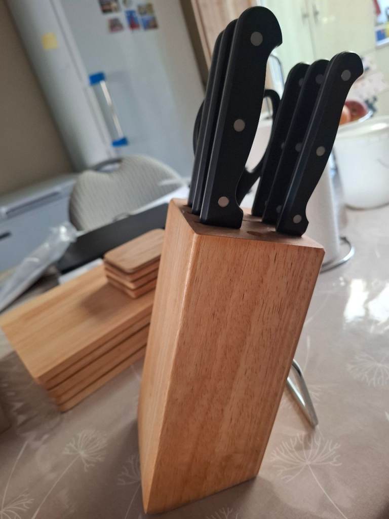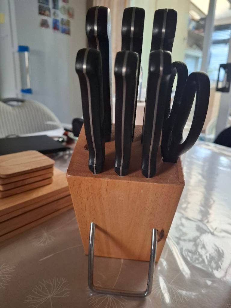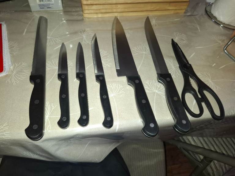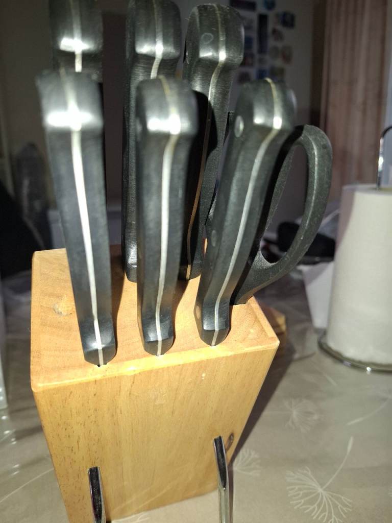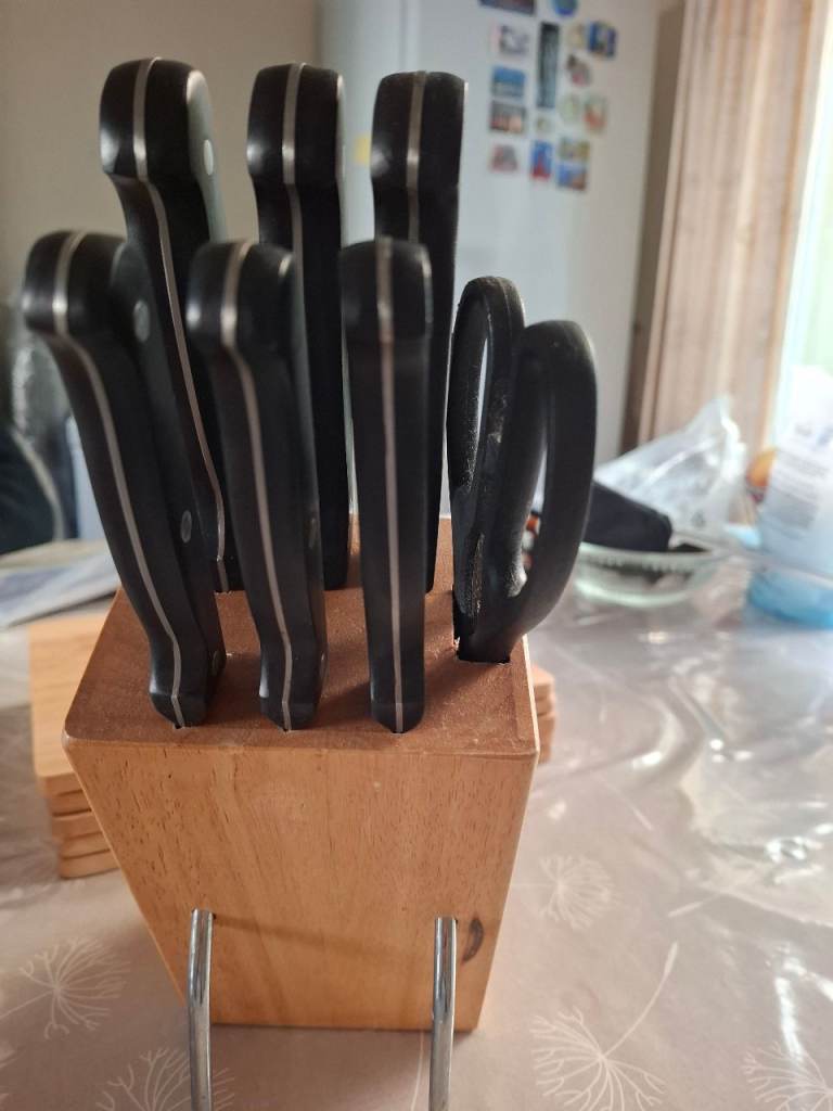 Wooden Knife Block Set comes with 6 knifes and scissors , knife sharpener missing . In good condition. Cash on collection Buyer must collect from Edmonton London N9