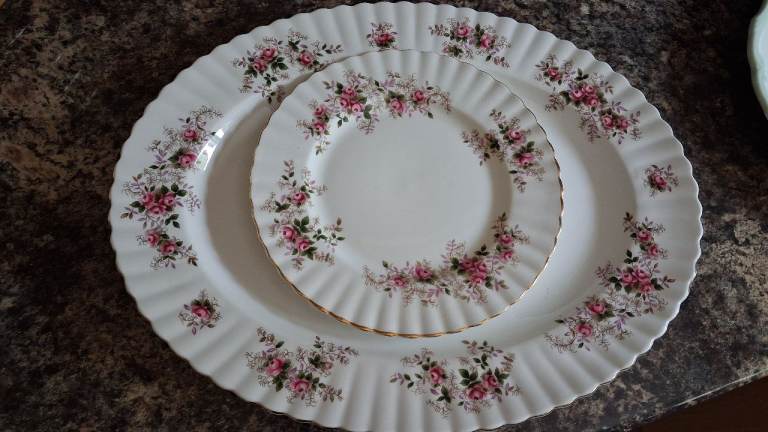 Two lovely Royal Albert Lavender Rose plates, one large serving platter and one dinner plate.