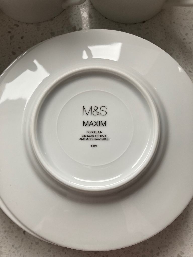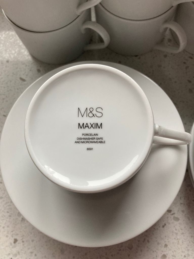 Maxim is still a range that is current in Marks and Spencer. Lovely clean white coloured cups and saucers that have used once, in as new condition. Dishwasher and microwave safe. Come from a smoke and pet free home.