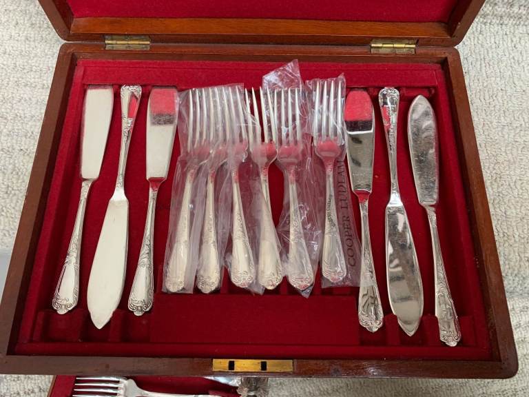 A complete vintage mahogany box of 12 fish forks & 12 fish knives by Cooper Ludlam, Master Cutlers - Silver plated and stamped EPNS A1 Sheffield England - Not all have been used and some are still in original packaging - Great condition, the silver plate is intact - One knife has a crest -