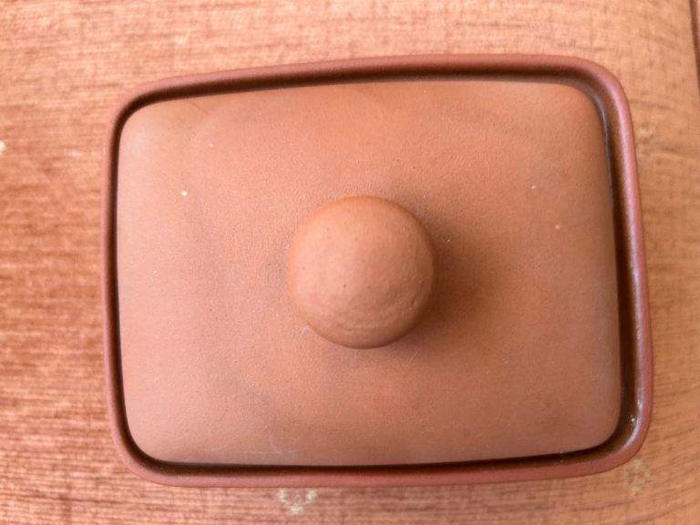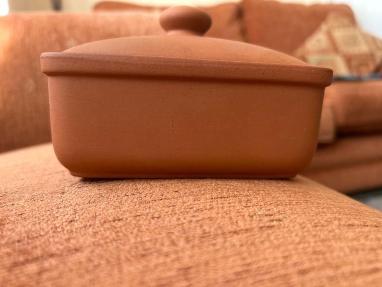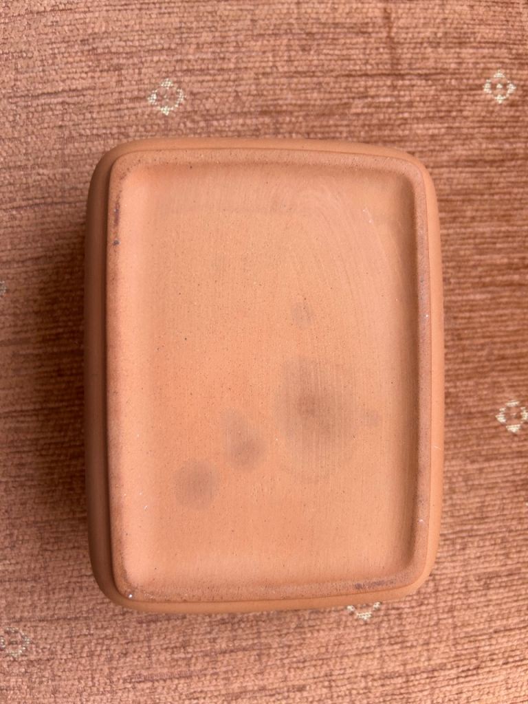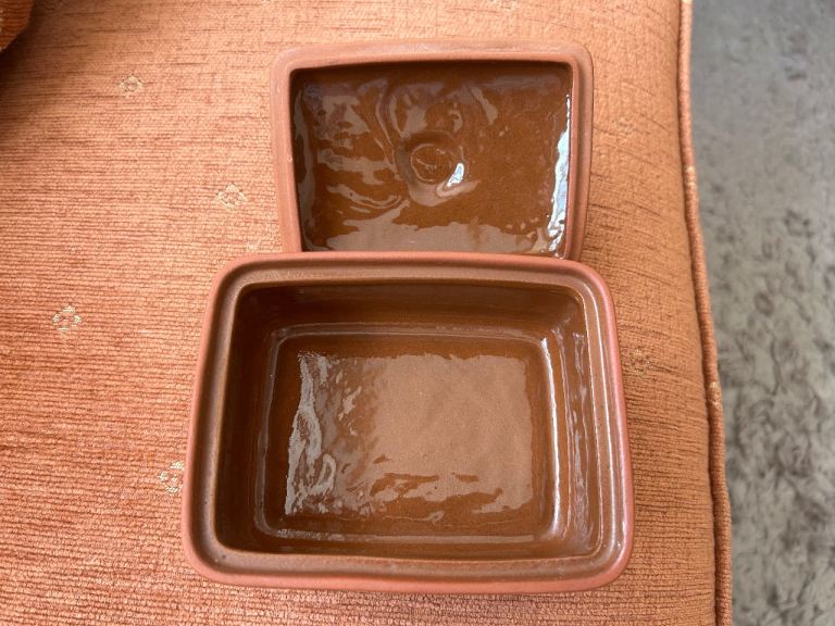 Original Suffolk Henry Watson terracotta butter box, with lid. manufactured in England. The Original Suffolk collection 8.5 x 13cm length. it has not been used just put in the cupboard. Reddish- brown colour