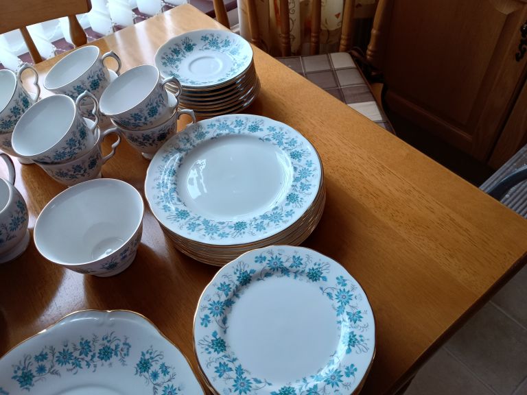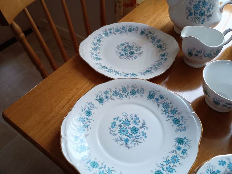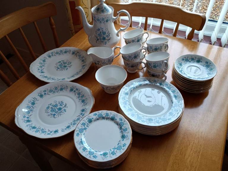 Lovely vintage dinner and tea set with a delicate white and blue floral pattern. Colclough Braganza pattern.