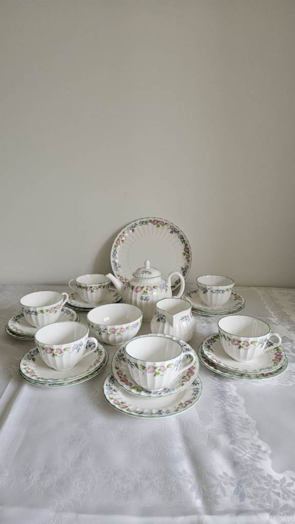Includes a teapot, milk jug, several cups and saucers, and various plates, perfect for entertaining.