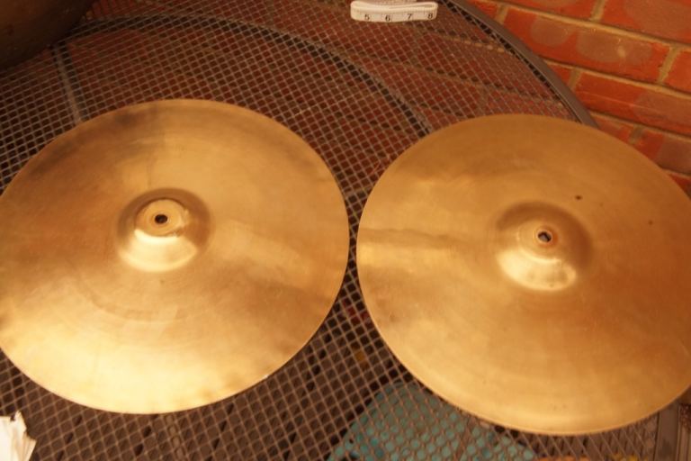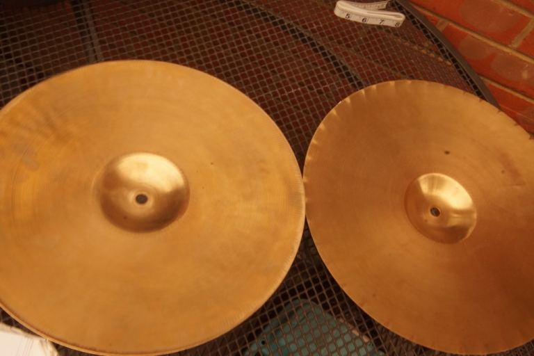 A PAIR OF PRE-SERIAL 1960S PAISTE FORMULA 602 SOUND EDGE HI HAT CYMBALS. LOGOS LONG GONE FROM CLEANING OVER THE YEARS.