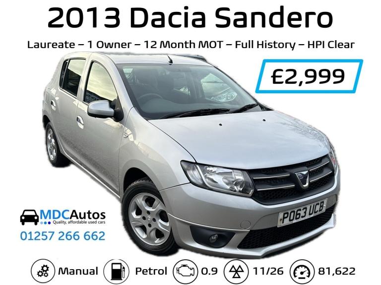 This 2013 Dacia Sandero TCe Laureate offers exceptional value with a full service history and a clear vehicle history check, having been owned by only one person. This well maintained 0.9L petrol model comes with a 3 month warranty and 12 months MOT provided on purchase, ensuring peace of mind. Inside, you'll find convenient features such as air conditioning, Bluetooth connectivity for your devices, and a quality radio system with 24 AM FM presets and sound by Arkamys., , The Dacia Sandero Laureate stands out with its impressive fuel economy, achieving a remarkable 57 miles per gallon, which is better than many other vehicles in its class. It also benefits from a low insurance group, making it an economical choice for everyday driving. Furthermore, the Sandero boasts a large boot space, offering practicality for shopping trips or carrying luggage, further enhancing its appeal as a sensible and cost effective vehicle., 3 months warranty, Next MOT due 01/11/2026, Full service history, 5 seats, Silver, 1 owner, 12V Power Socket, 15in Wheel Trims - Kalahari, ABS - Anti-lock Braking System, ASR - Traction Control, AUX Input, Air Conditioning, Air Recirculation - 4-speed Heating and Ventilation, Air Vents - Chrome Surrounds, Airbags - Driver, Airbags - Front Passenger, Airbags - Front Passenger Deactivation, Airbags - Front Side, Anti-intruder Automatic Door-locking System, Bluetooth Connectivity, Bumpers - Front and Rear Body Coloured, Central Locking - Remote, Centre Console Surround - Graphite, Child Locks in Rear Doors, Chrome Front Grille, Chrome Heating Control Inserts, Cruise Control and Speed Limiter, DRL - Daytime Running Lights, Door Handles - Body Coloured, Door Handles - Interior Front - Graphite, Door Handles - Interior Rear - Black, Door Mirrors - Body Coloured, Door Mirrors - Heated and Electrically Adjustable, Door Open - Visual Warning, Driver and Front Passenger Seat Belt Unfastened - Visual and Audible Warning, EBA - Emergency Brake Assist, ECO Mode, ESC - Electronic Stability Control, Electric Windows - Front and Rear, Front Courtesy Light, Front Fog Lights, Front Passenger Grab Handle, Front Reading Lights, Gear Knob - Leather, Gear Lever Cap Insert - Chrome, Glovebox Light, Grab Handles - Rear Passenger with Coat Hook, Headlights - Single Optic with Chrome Surrounds, Headlights Left On - Audible and Visual Warning, Headrests - Rear Height Adjustable x3, Heated Rear Window, Height-Adjustable Drivers Seat, Height-Adjustable Front Headrests, Height-Adjustable Steering Wheel, High Level Third Brake Light, ISOFIX Points for Child Seats in Both Outer Rear Seats, Instrument Dial Surrounds - Chrome, Luggage Compartment - Light, Map Pockets on Front Seatbacks, Power Assisted Steering, Radio with 24 AM-FM Presets and Sound by Arkamys, Seats - 60-40 Split Folding Rear, Speakers - x2 - Front, Speakers - x2 - Rear, Steering Column Mounted Fingertip Controls, Steering Wheel - Leather, Sunvisor with Vanity Mirror - Passenger, Thatcham Approved Engine Immobiliser, Tinted Windows, Trip Computer - 7 Function, Tyre Inflation Kit, USB Connection for MP3 Players, BANK TRANSFER WELCOME - FINANCE AVAILABLE, £3,000