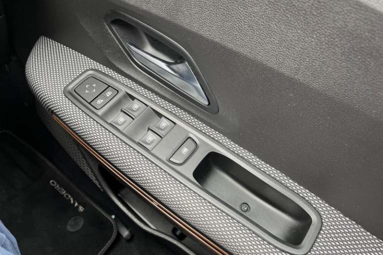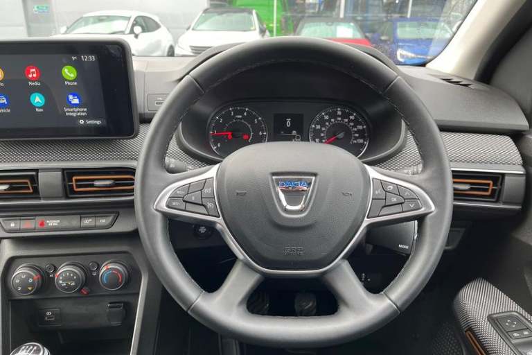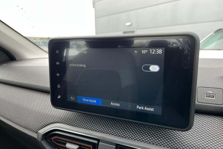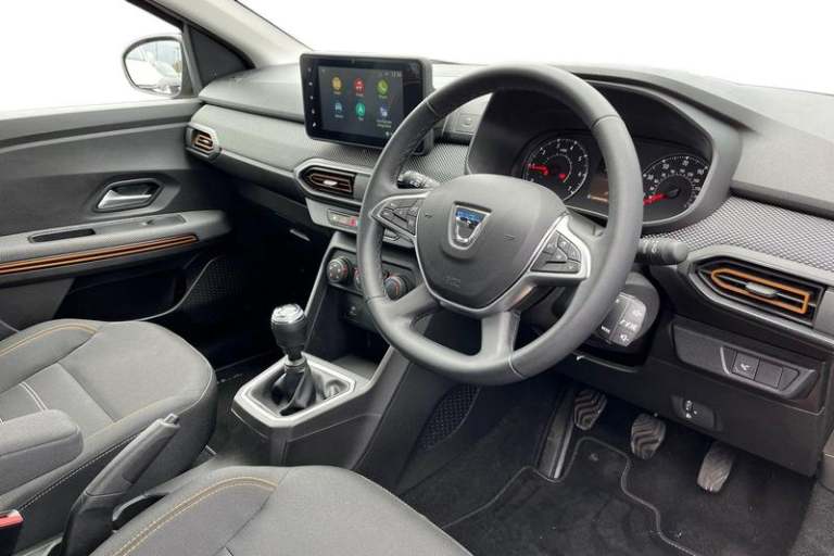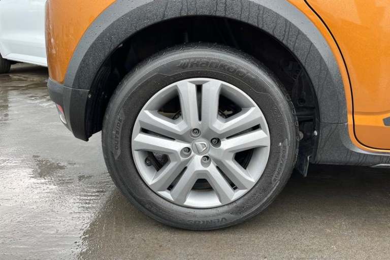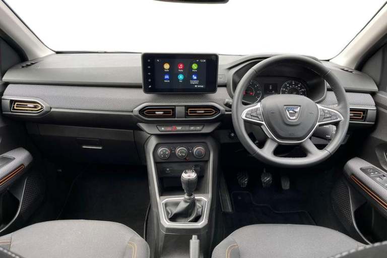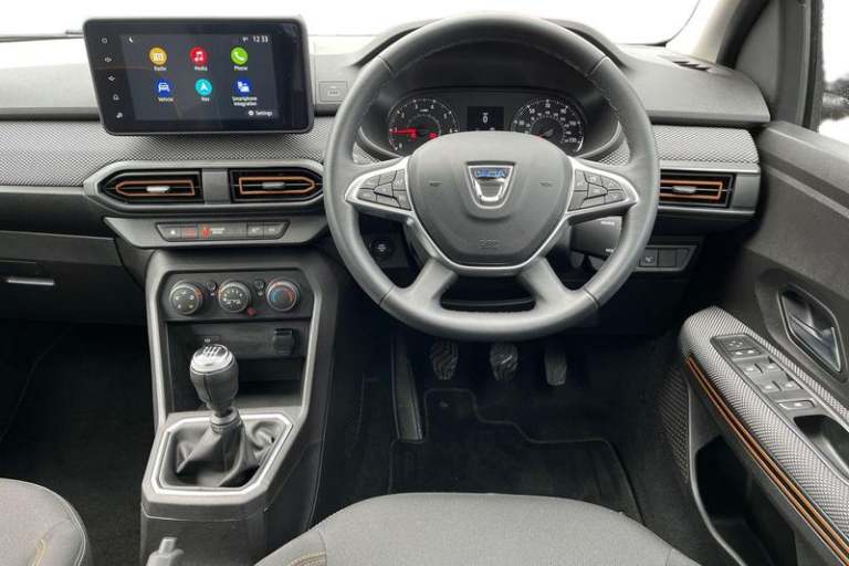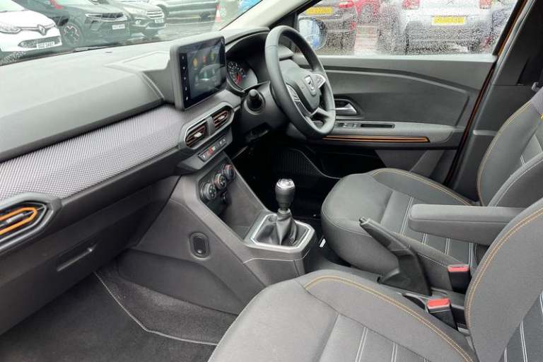 3.5 TFT instrument panel with on-board computer, Cruise control with speed limiter, eCall emergency call system, Eco mode, Electric power assisted steering, Rear parking sensors, Rev counter, Reversing camera, Stop/start system, 3 speed windscreen wipers, Auto lighting, Automatic wipers, Body colour door handles, Body colour door mirrors, Body coloured bumpers, Chrome longitudinal roof bars, Chrome radiator grille, Electrically adjustable and heated door mirrors, Front fog lights, Heated rear window, High level third brake light, LED automatic daytime running lights, LED Y-shape Dacia signature lighting, Modular roof bars, One touch electric front windows, Rear electric windows, Rear side wing doors, Rear wash/wipe, Stepway inscription on radiator grille and roof bars, Tinted windows, 1/3 to 2/3 split folding rear seats, 12 volt front socket, 12 volt rear socket, 3 height adjustable rear headrests, 3 seat rear bench, Driver + passenger vanity mirrors, Fabric upholstery, Fixed smartphone holder on dashboard, Front armrest, Gear shift indicator, Height adjustable driver seat, Height adjustable front headrests, Height/depth adjustable steering wheel, Isofix points for child seats in both outer rear seats, Manual air conditioning, Satin chrome interior door handles, Satin Chrome/Copper orange air vents, Single front passenger seat, Soft feel steering wheel, Steering wheel controls, 3x3 point rear seatbelts, ABS and Emergency brake assist, Automatic emergency braking system, Child