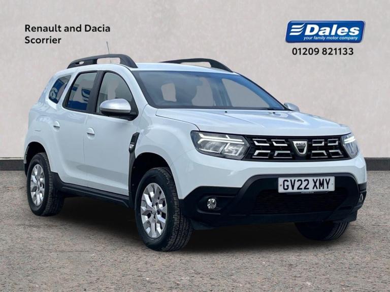 The 2023 Dacia Duster 1.0 TCe 90 Expression 5Dr Estate in solid Glacier White boasts a sleek design with 16"" alloy wheels and black detailing, including black longitudinal roof bars and side sills. It features a spacious interior with a 3-seat bench in the 2nd row and 3 rear height-adjustable headrests. The cabin is equipped with an 8"" media display with smartphone replication and 6 speakers, along with features like cruise control, electric adjustable/heated door mirrors, and a satin chrome interior finish. Safety features include ASR traction control, front and side airbags, hill start assist, reversing camera, and rear parking sensors. The Duster ensures a comfortable ride with height-adjustable seats, manual air conditioning, and a soft feel leather steering wheel. This model comes with modern technology such as eCall emergency system, DAB radio, USB connectivity, and Y shaped LED headlights with rear LED lights.