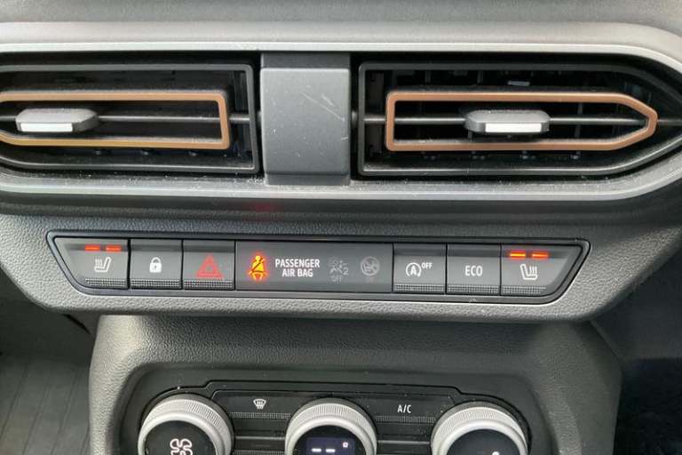 3.5 TFT instrument panel with on-board computer, Blind spot warning, Check control system, Cruise control and speed limiter, Driver attention warning, e-Call (emergency call), Eco mode, Electric power assisted steering, Emergency Stop Signal (ESS), Event data recoder, Extended grip switch, Exterior temperature display, Front parking sensors, Lane departure warning, Lane keep assist, One touch indicators, Rear parking sensors, Rescue code, Rev counter, Reversing camera, Service interval indicator, Stop/start system, Traffic sign recognition with speed alert/Intelligent speed assist (ISA), Voice control for telephone and radio, 3 speed windscreen wipers, Auto lighting, Automatic wipers, Black longitudinal roof bars, Black radiator grille, Body coloured door handles, Body coloured front and rear bumpers, Copper brown Stepway marking on roof bar, Copper brown Dacia logo on wheels centre caps, Copper brown deco part on fog lamp area, Copper brown door mirrors, Dark glass, Door sills in topographic pattern, Drivers one touch electric windows, Electric headlight adjustment, Electrically adjustable door mirrors, Front fog lights, Front LED Indicator lights, Headlights with LED low beam illumination, Heated door mirrors, Heated rear window, High level third rear brake light, Initial anti-corrosion treatment, LED automatic daytime running lights, Modular roof bars, Rear electric windows, Rear side wing doors, Rear wash/wipe, Shiny black shark antenna, Snorkel sticker with topographic