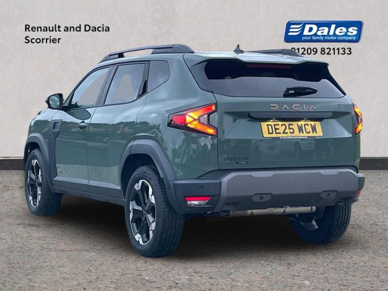 The Dacia Duster 1.6 Hybrid 140 Extreme 5Dr Auto Estate in a striking Green colour is a true beauty. With only 2000 miles on the clock, this 2025 model features 18"" Semi diamond cut tagasan alloy wheels that complement its rugged look. The interior is equipped with a 10.1"" media nav live system complete with connected navigation, DAB, smartphone replication, Bluetooth, and connected services. Safety features include 6 airbags, ABS, emergency brake assist, lane departure warning, and blind spot warning. The vehicle also boasts modern conveniences like automatic air conditioning, Apple CarPlay, Android Auto, cruise control, heated seats, and a wireless phone charger. With a spacious interior, advanced technology, and robust design, the Dacia Duster is ready to take on any adventure on British roads.