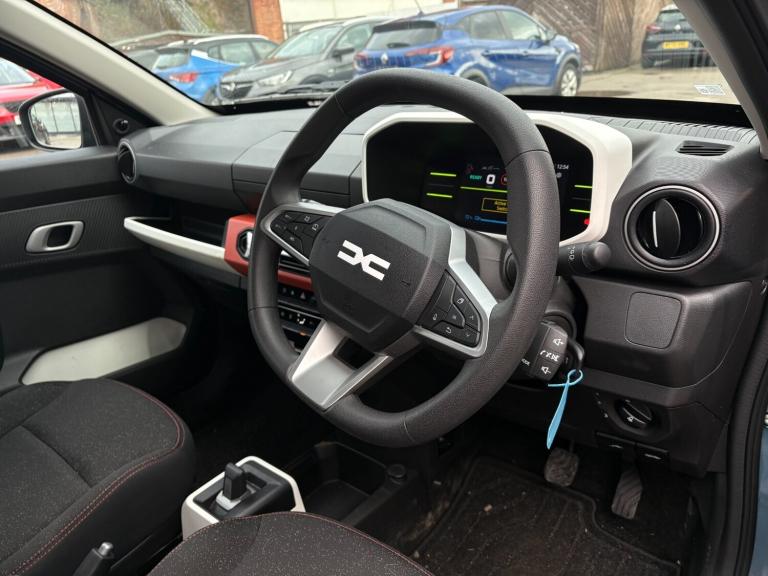 ..Cruise control + speed limiter, Driver attention warning, e-Call (emergency call), Electric power assisted steering, Emergency Stop Signal (ESS), Event data recorder, Lane departure warning system, Lane keep assist system, Rear parking sensors, Rescue code, Traffic sign recognition with speed alert/Intelligent speed assist (ISA), Mode 3 charging cable, Media control - DAB radio with display on instrument panel, bluetooth, 2 speakers, USB-C plug, USB socket, 3 speed windscreen wipers, Automatic headlights, Automatic wipers, Black door mirrors, Body colour door handles, Front and rear Bumper, body coloured with black elements and grey insert, Front electric windows, Heated rear window, High level third rear brake light, LED automatic daytime running lights, LED Y shape Dacia signature lighting, Manually adjustable door mirrors, Rain sensor, Rear fog lights, Rear side wing doors, Rear wash wiper, Tinted windows, 1 piece folding rear bench seat back, 12V socket in front, Carpet mats, Fabric upholstery, Front headrests, Grey interior door handles, Height adjustable steering wheel, ISOFIX attachment on outer rear seats, Manual air conditioning, Rear headrests, Single front passenger seat, Soft feel steering wheel, 6 airbags - Driver, front passenger, curtain and side airbags, ABS+EBA, Alcohol imoboliser predisposal, Automatic Emergency Braking System (AEBS), Child locks on rear doors, Door open visual and audible warning, Driver and passenger seatbelt not fastened warning, ESP + Hill Start Assist, Front seatbelt pretensioners, Side impact protection, Two 3 point rear seatbelts, Tyre pressure monitor, Engine immobiliser, Remote central locking, Brick red dashboard decopart, White airvents inserts, 14'' steel wheels, Cians styler cover for 14'' steel wheels, Tyre inflation kit