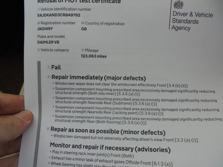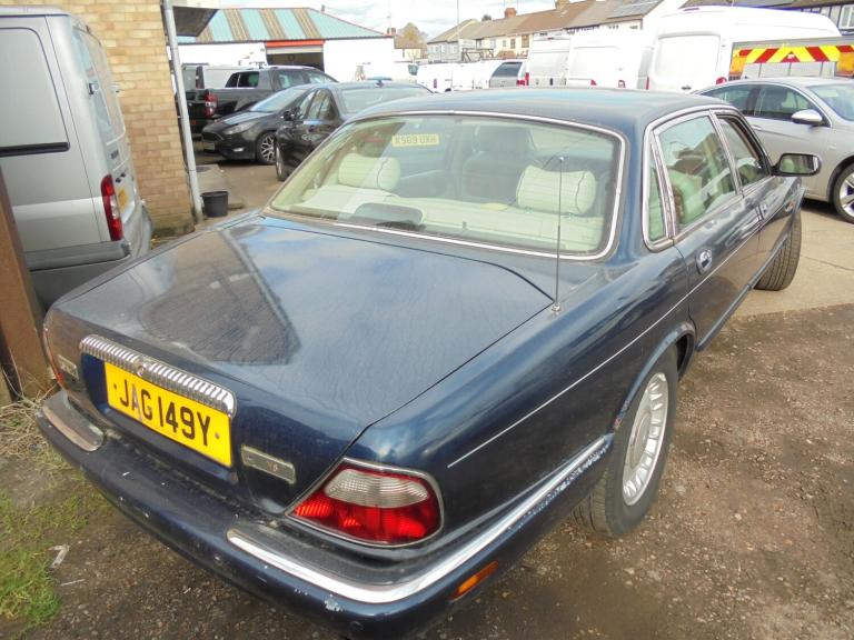 1999 DAIMLER V8 LWB SALOON, 4.0 V8 PETROL, IN BLUE, LOW MILEAGE AT 123000 MILES, MASSIVE FOLDER OF BILLS AND HISTORY, FULL LEATHER TRIM, VEHICLE DOES COME WITH THE PRIVATE PLATE, MOT FAILURE OWING TO REQUIRING WELDING TO SUBFRAME, USUAL DAIMLER SPEC INCLUDING ELECTRIC HEATED SEATS, CD MULTICHANGER, CLIMATE CONTROL, BODYWORK AS STATED WILL NEED ATTANTION AND AS YOU CAN TELL FROM THE PICTURES WHILST THERE ARE NO SIGNIFICANT DENTS THE PAINTWORK HAS DULLED OVER TIME, THE ENGINE APPEARS TO PULL WELL IN ALL GEARS THERE IS A STICKY TAPET ON TICK OVER, INTERIOR-REAR SEAT IS GOOD FOR AGE, FRONT SEAT LEATHER IS CRACKING AND WILL REQUIRE ATTENTION, THE DISPLAY ON THE CLIMATE CONTROL IS BLANK HOWEVER THE HEATER DOES WORK, RADIO DISPLAY IS OK, HEATED FRONT WINDSCREEN, ORIGINAL DAIMLER TOOK KIT INTACT, WOULD MAKE A FANTASTIC PROJECT AND COMES COMPLETE WITH QUITE VALUABLE JAG NUMBER PLATE, INSPECTIONS ARE WELCOME, SENSIBLE OFFERS INVITED, DOES START AND DRIVE.