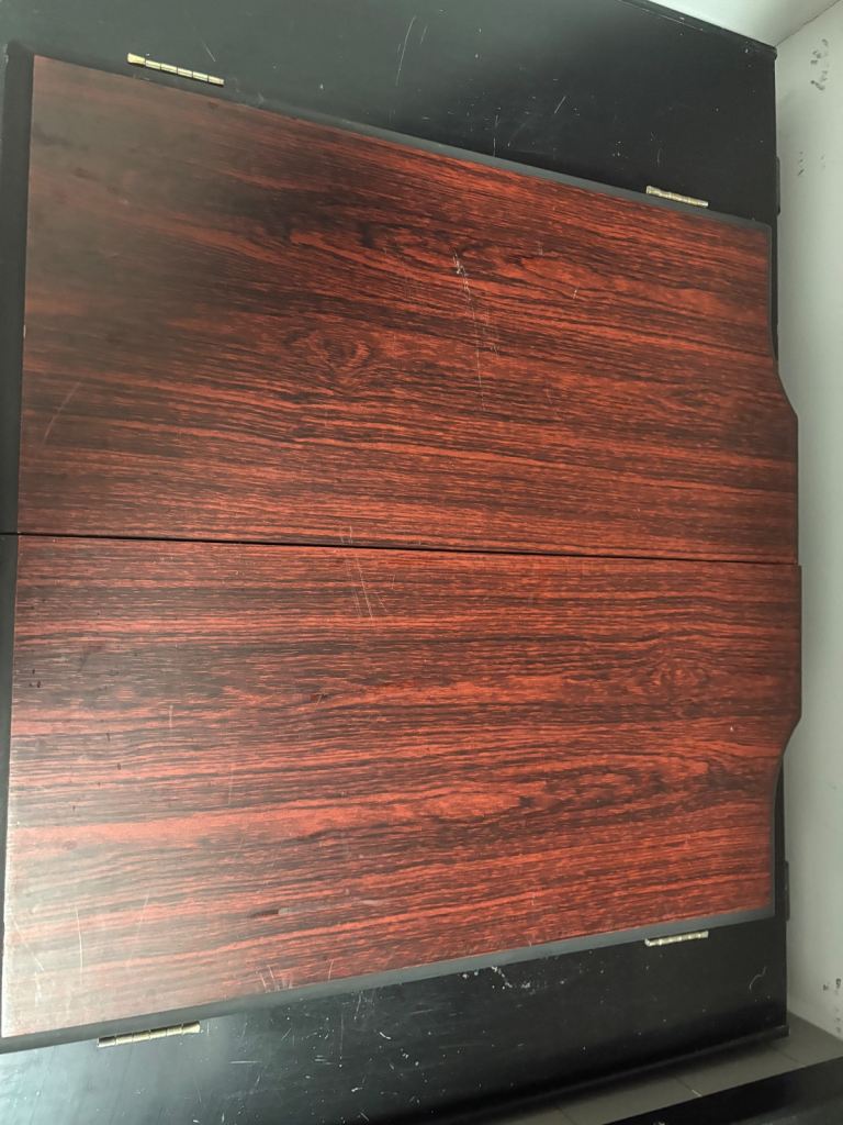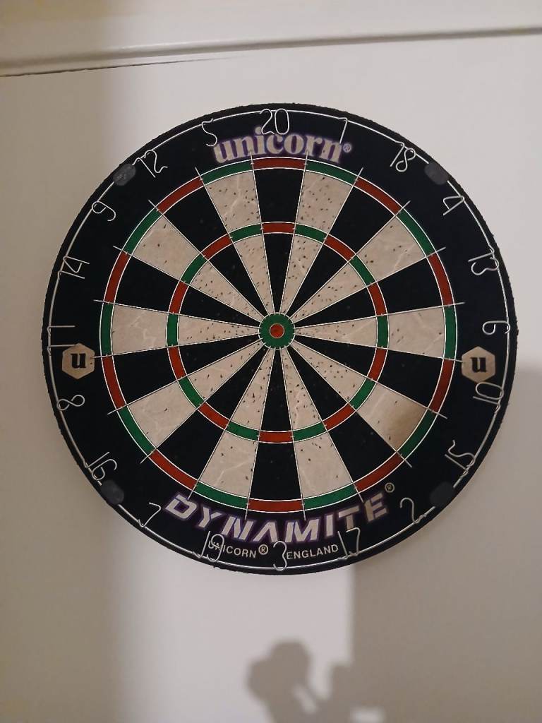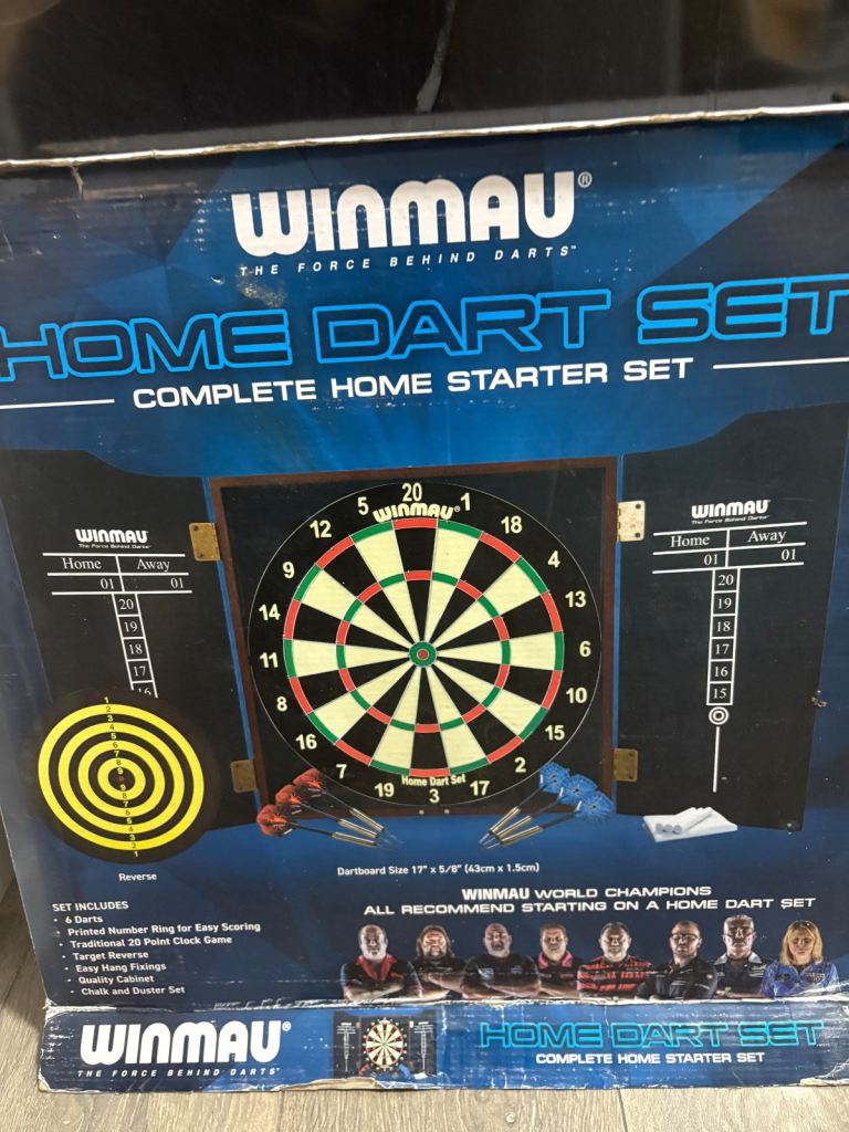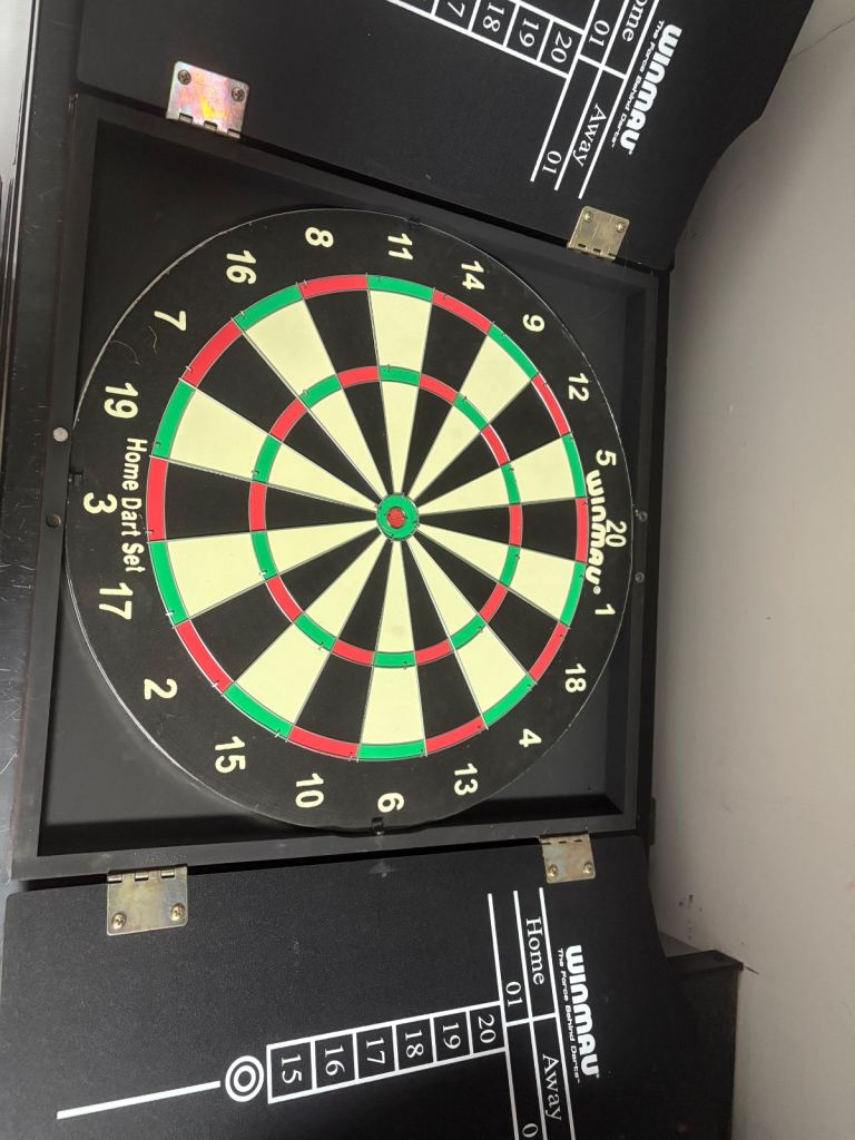 Dartboard fitted in wooden closing door case with scoreboards on either side