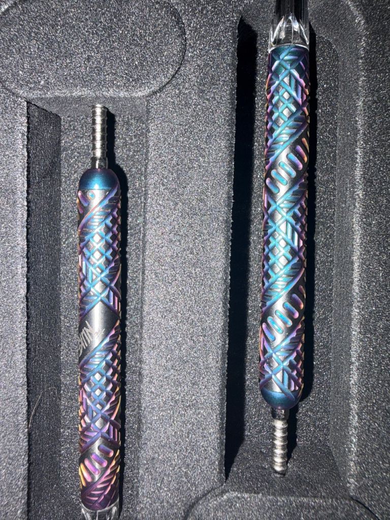 Includes three darts with striking blue and purple barrels, along with extra accessories.